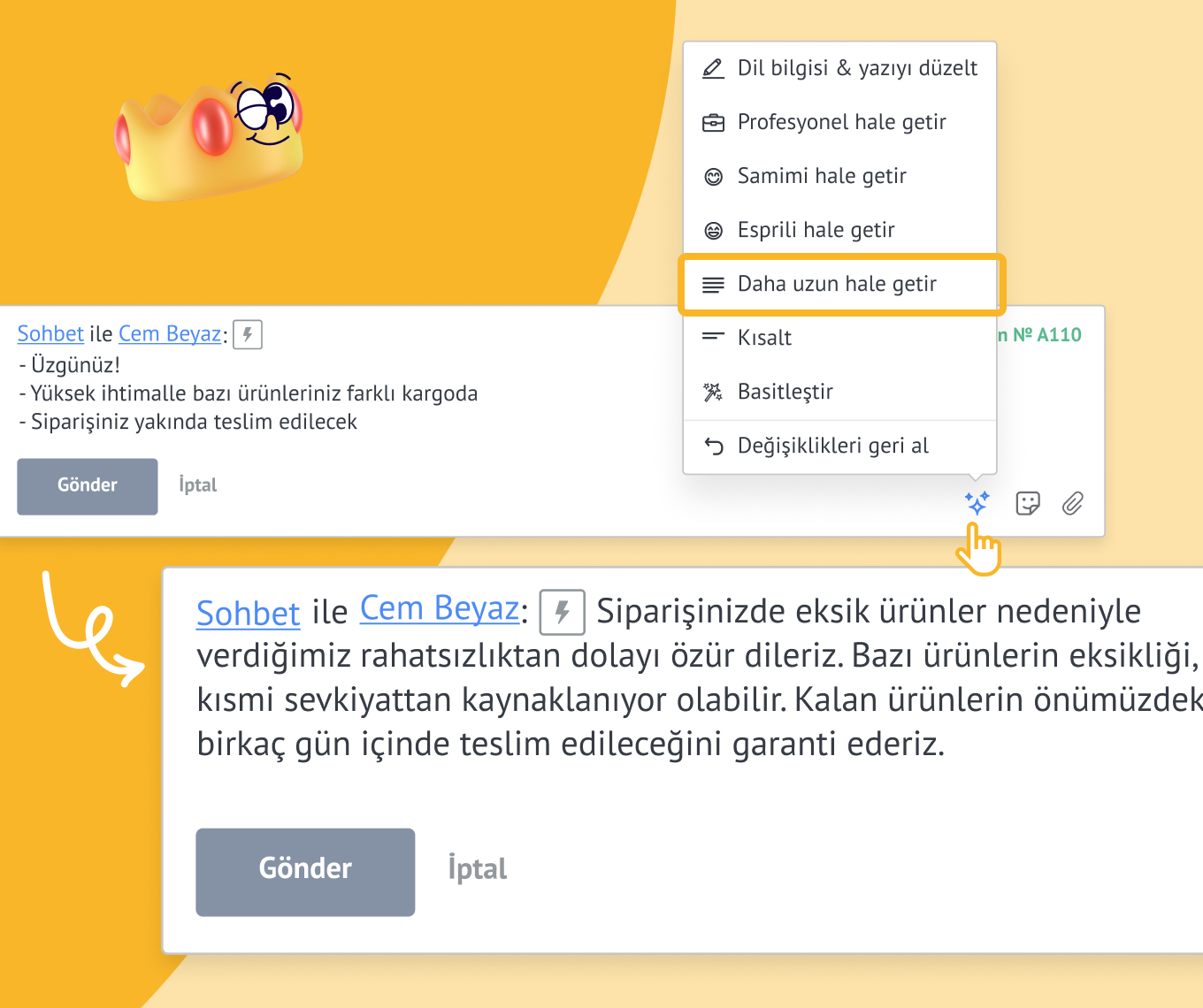Kommo AI ile basmakalıp cevapları bir kenara bırakın. Kommo AI, markanızın sesini analiz eder ve taslaklarınızı size özgü mesajlarla geliştirir. Daha kısa mı olsun? Ya da komik? Yoksa daha profesyonel mi? Sadece bir taslak yazın, Kommo AI onu mükemmelliğe ulaştırsın.