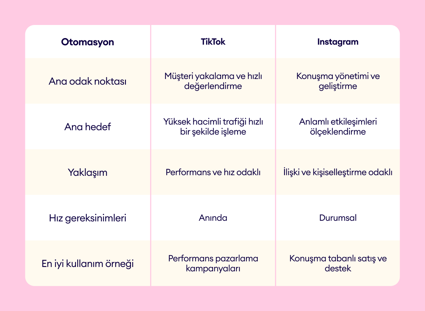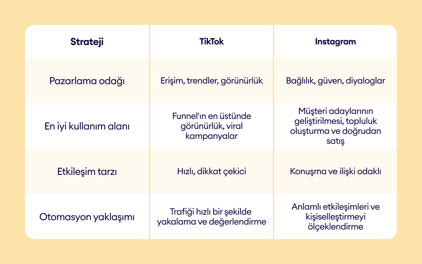 Her iki platform da aynı otomasyonlara izin verir, ancak TikTok hızı ve yüksek hacimli trafikten müşteri yakalamayı önceliklendirirken, Instagram etkileşimleri yönetmeye ve ilişkileri büyük ölçekte geliştirmeye odaklanır.