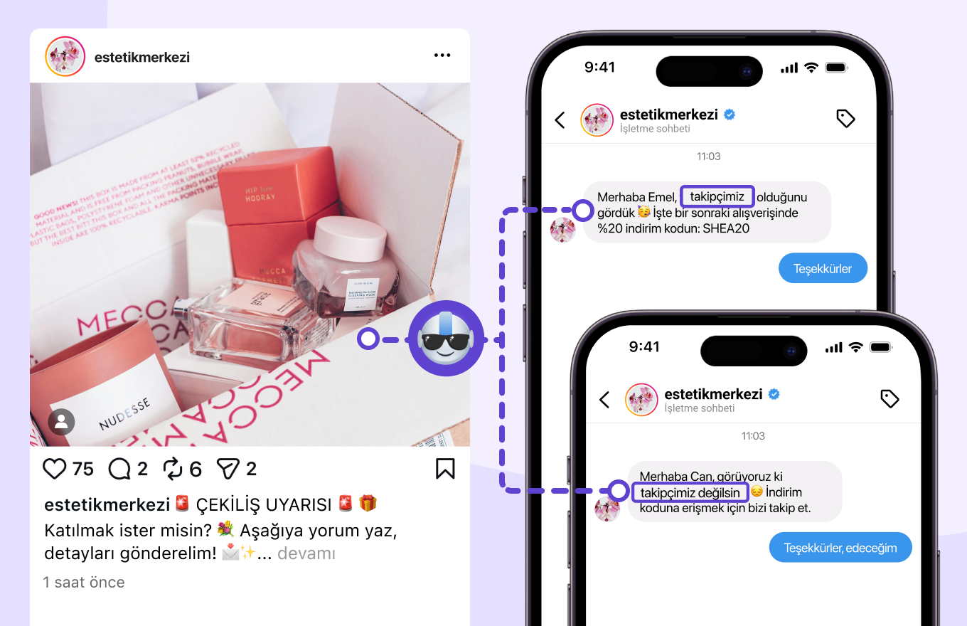Aynı güçlü otomasyonlar TikTok ve Instagram'da sorunsuz bir şekilde çalışır ve kişiselleştirme veya kontrolü kaybetmeden müşterileri yakalamanıza, anında yanıt vermenize ve konuşmaları ölçeklendirmenize yardımcı olur.