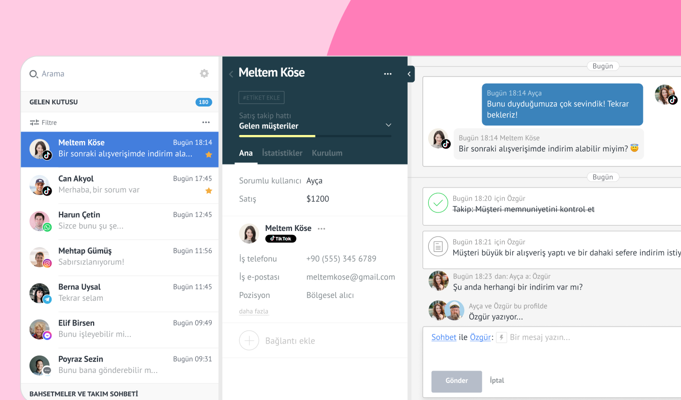 Tüm Instagram ve TikTok DM'leri, yorumları, bahsetmeler ve takip eden konuşmalar, kişiler ve anlaşmalarla bağlantılı olarak tek bir yerden yönetilir.