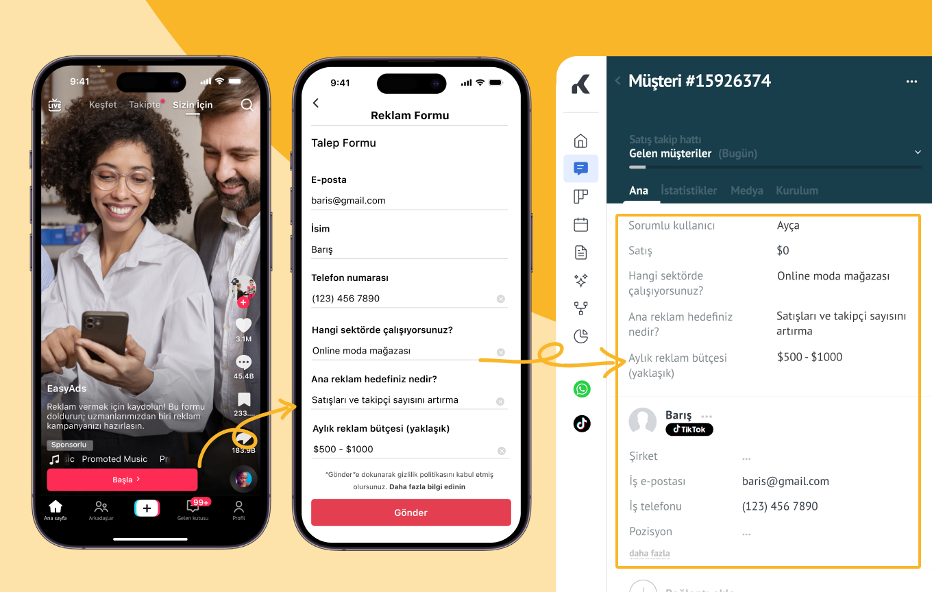 TikTok ve Instagram reklamlarından, formlardan ve bağlantılardan gelen müşteriler otomatik olarak yakalanır, kaynağına göre etiketlenir ve doğru şekilde yönlendirilir.