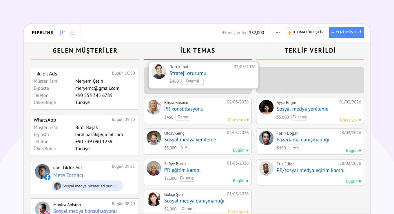 Her müşteri ve görüşme, tek bir görsel satış takip hattı üzerinden takip edilir.