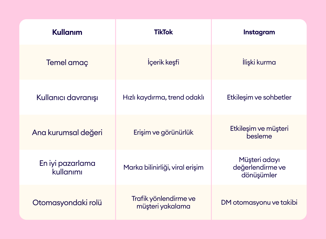 TikTok keşif ve erişim için tasarlanmışken, Instagram sohbetler ve ilişkiler için tasarlanmıştır. Bu stratejik farklılıkları anlamak, her bir platformu pazarlama, mesajlaşma ve otomasyon için etkili bir şekilde kullanmanın anahtarıdır.