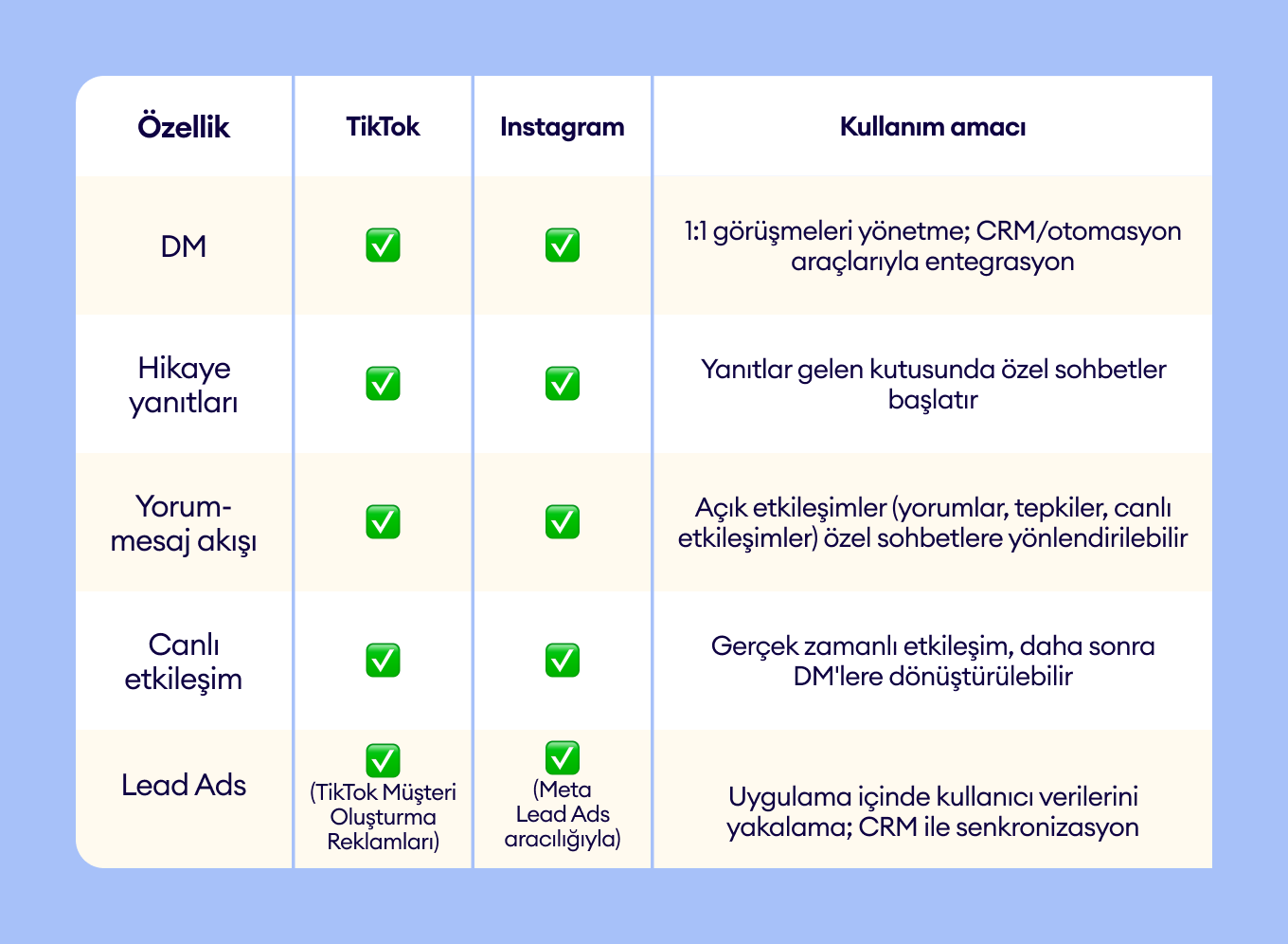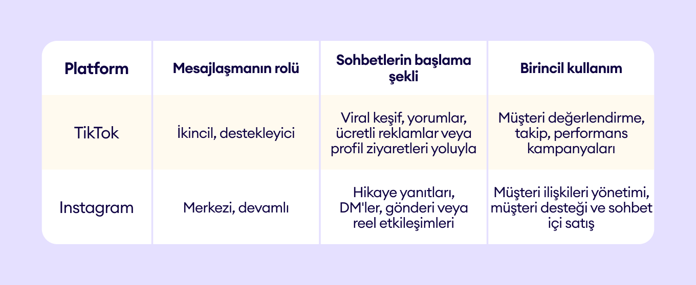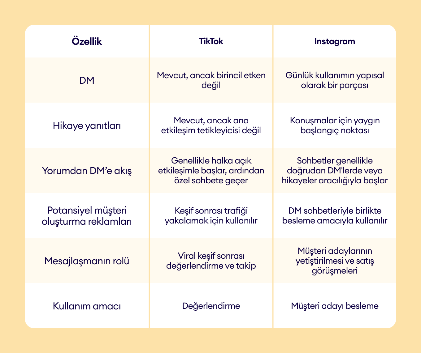 Bu karşılaştırma, TikTok ve Instagram'ın sadece farklı içerik formatları sunmakla kalmadığını, müşteri yolculuğunun farklı aşamalarını destekleyerek markaların mesajlaşma, otomasyon ve etkileşim yaklaşımlarını şekillendirdiğini gösteriyor.
