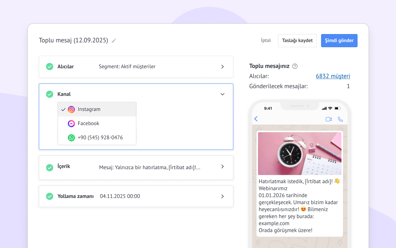 Mesajınızı hemen gönderin veya daha sonra yayınlanmak üzere birden fazla toplu mesaj planlayın — Kommo bunu mümkün kılar.
