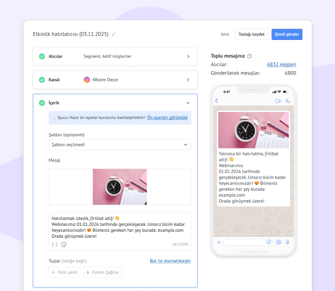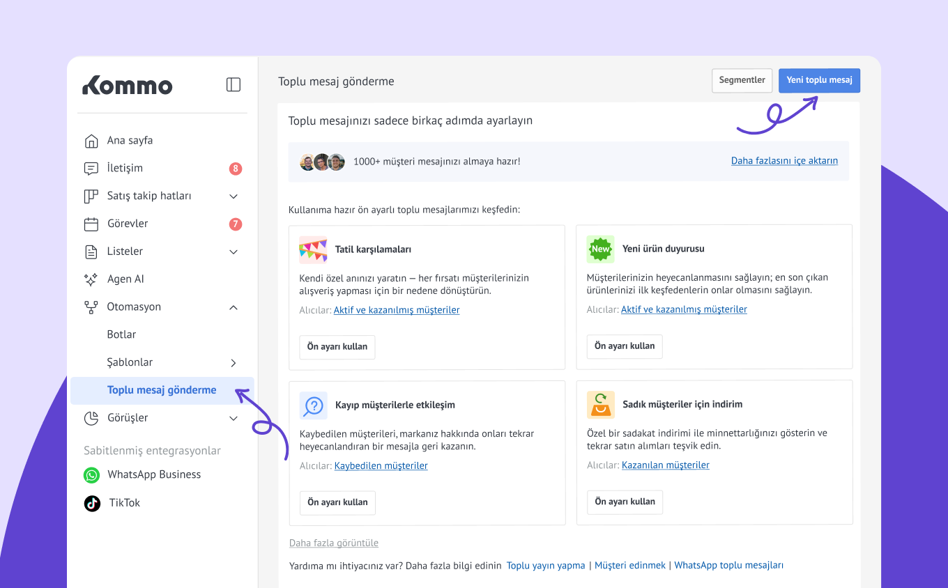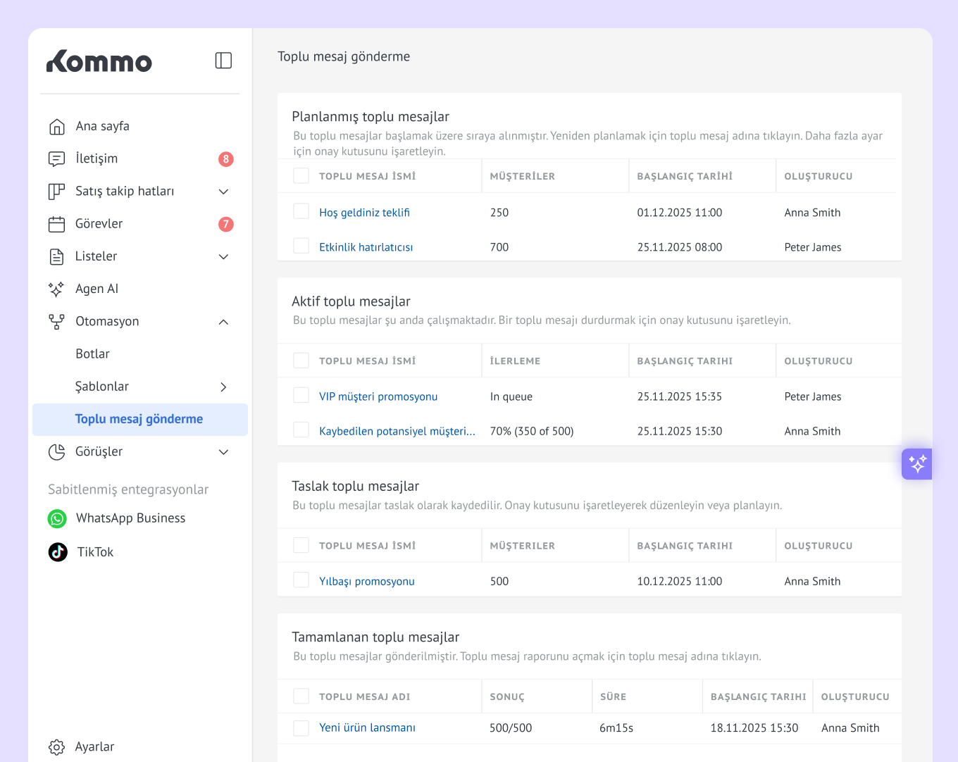 Kommo ile bir toplu mesaj göndermek, tüm kanallardaki müşterilere anında ulaşarak etkileşimi ve yanıtları artırır. Kommo'nun otomasyon ve izleme özellikleri, her mesajı bir büyüme fırsatına dönüştürür.