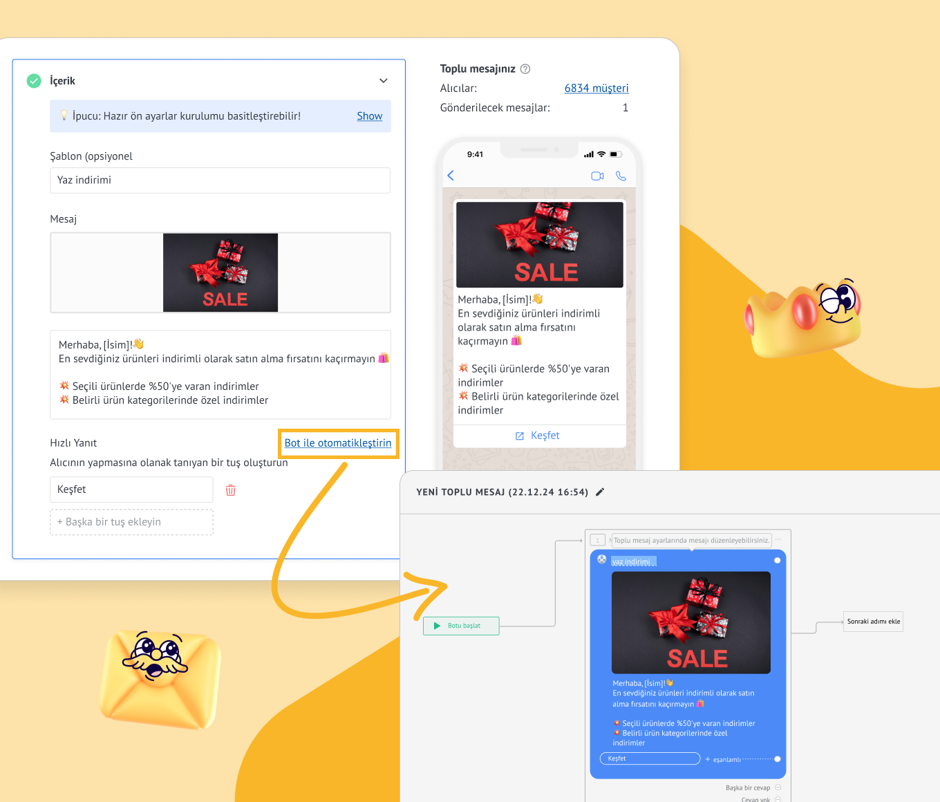 Toplu mesajlar, işletmelerin geniş kitlelere anında ulaşmasını sağlayarak müşterileri bilgilendirir, ilgilerini canlı tutar ve ölçülebilir sonuçlar elde etmelerini sağlar.