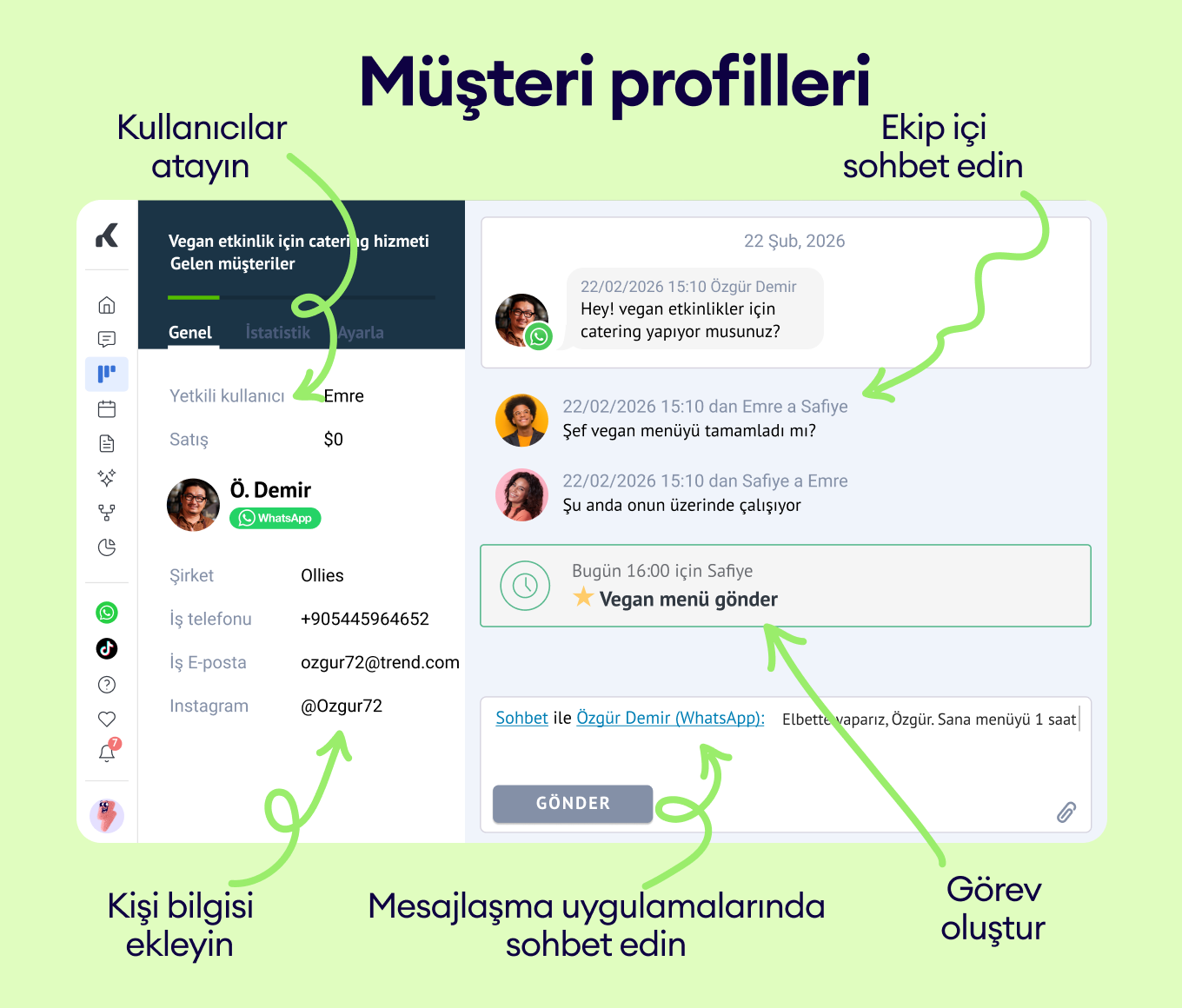 Müşteri profilinde, sık sorulan sorular için şablonlu mesajlar gönderebilir, not alabilir ve iş arkadaşlarınızdan yardım isteyebilirsiniz – geçmiş konuşmaların kayıtlarını kaybetmeden.