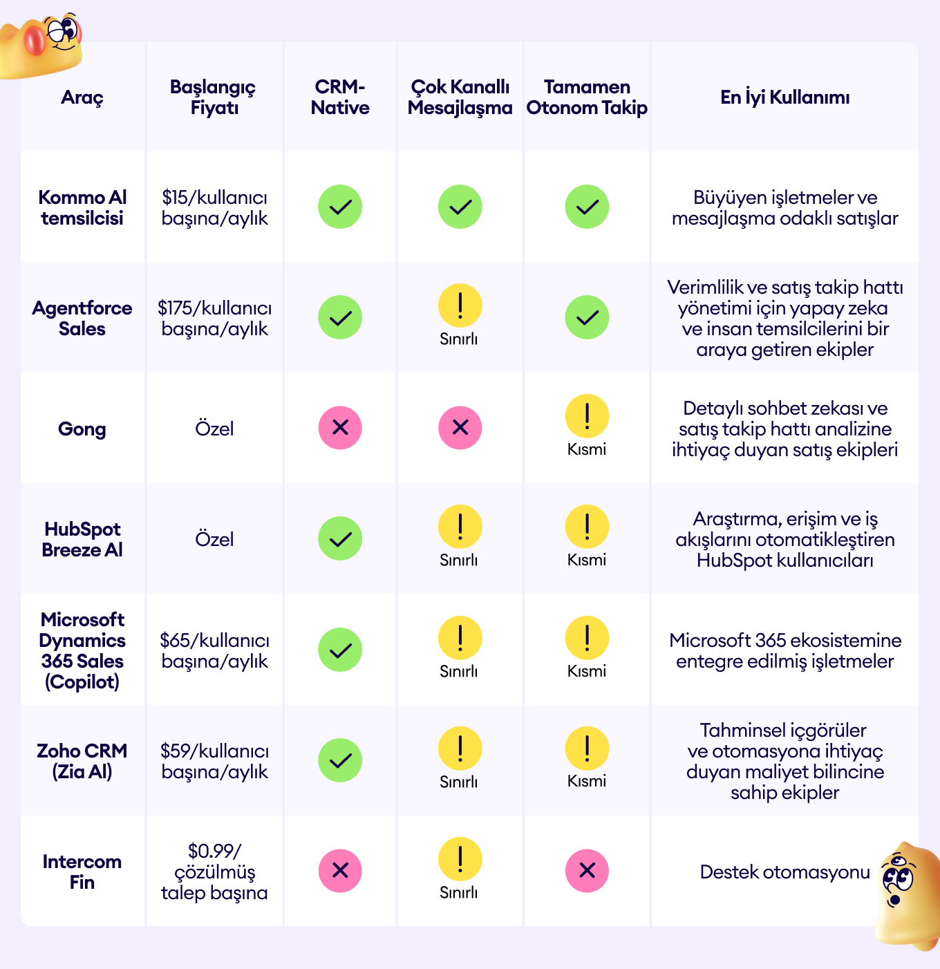 Bu tablo, önemli yapay zeka satış danışmanlarını, fiyatlandırmalarını ve yeteneklerini karşılaştırmaktadır. Kommo AI temsilcisi, CRM tabanlı, çok kanallı, tamamen otonom bir çözüm olarak öne çıkmakta ve konuşmaları zahmetsizce satışa dönüştürmek isteyen ekipler için ideal bir seçimdir.