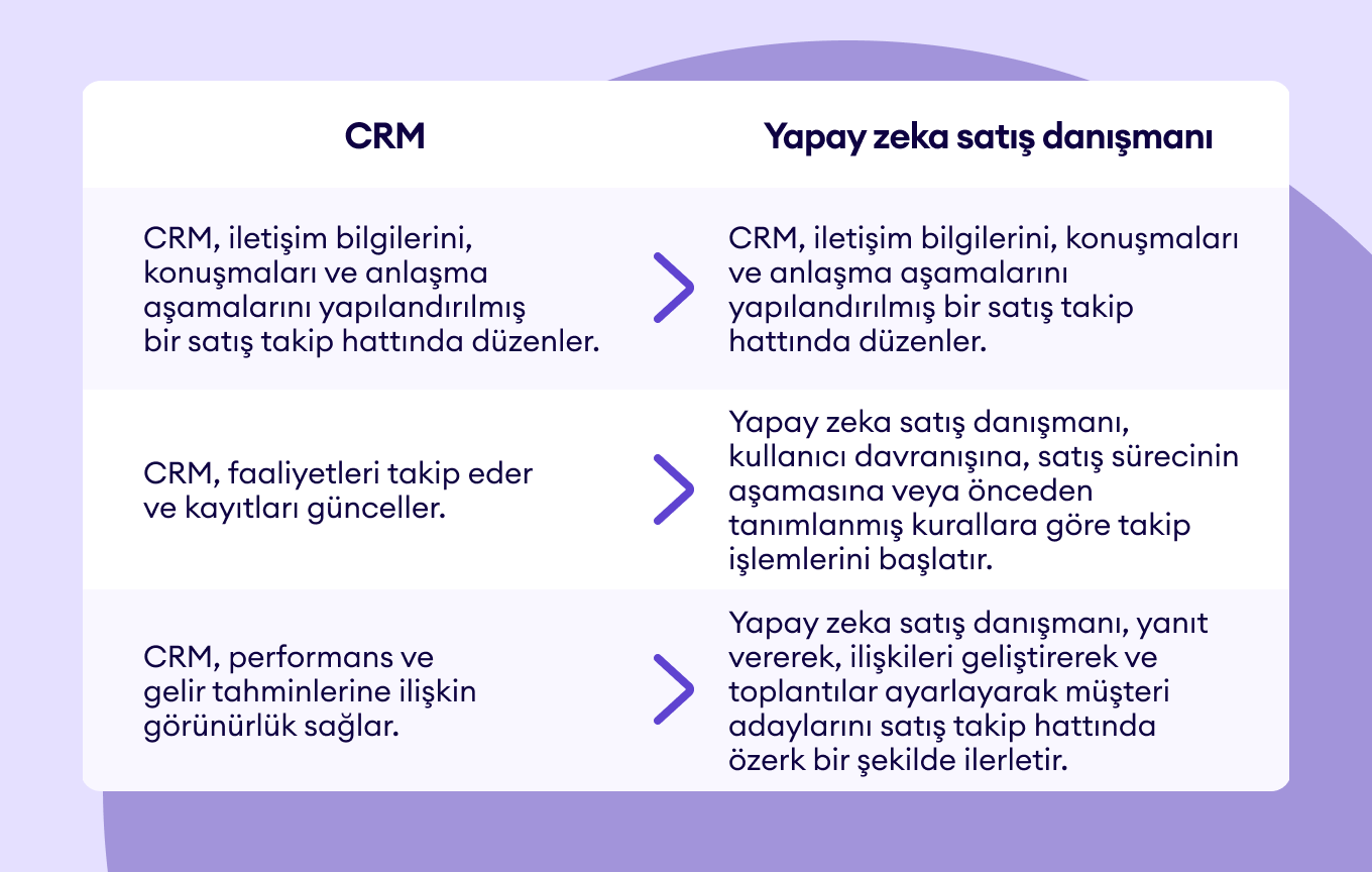Yapay zeka satış danışmanlarını ve CRM'leri ayrı veya birbiriyle rekabet eden araçlar olarak düşünmek yerine, bunları birbirini tamamlayan ve birlikte çalışan sistemler olarak görmek daha doğrudur.