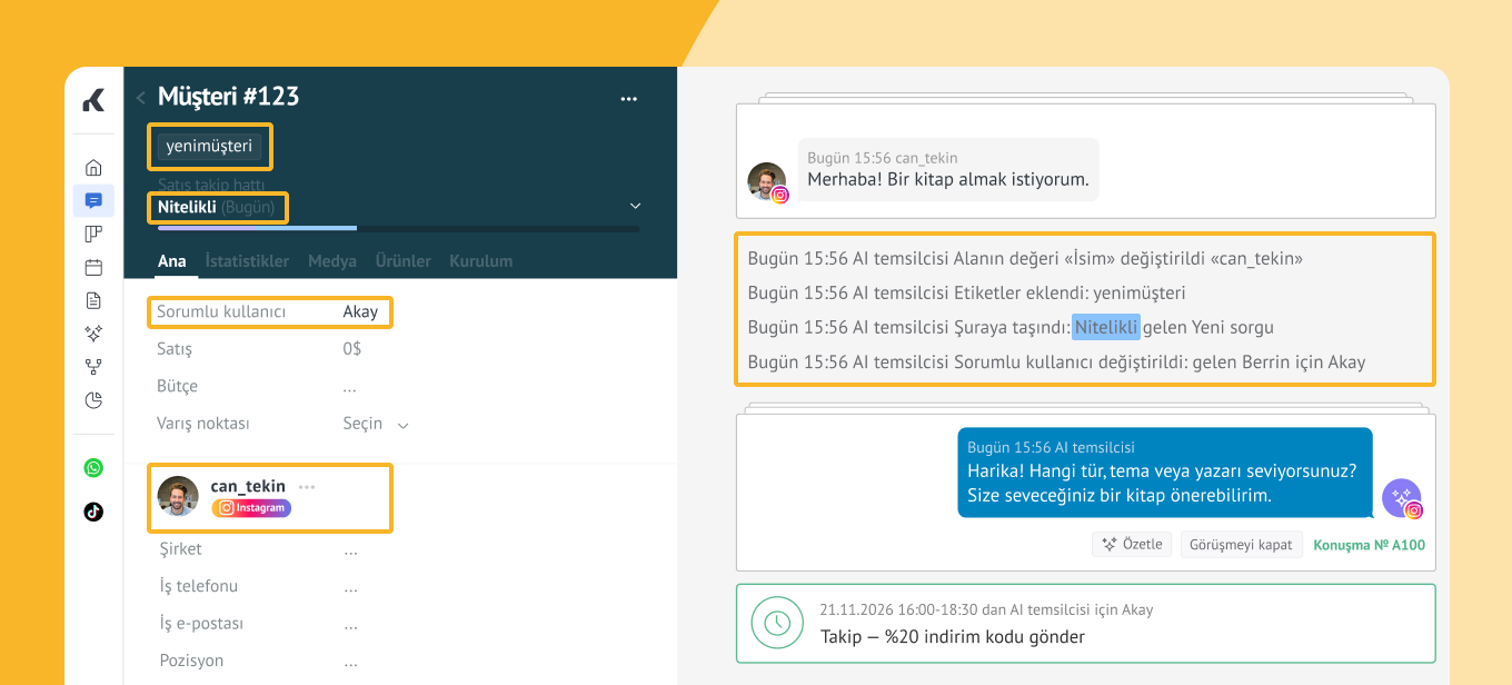 Yapay zeka agent’ları, erken etkileşimleri ve takipleri otomatikleştirerek dönüşümleri artırır. Kommo AI temsilcisi gibi, satış takip hattınıza bağlandığında, her konuşma yapılandırılmış ve ölçülebilir kalır.