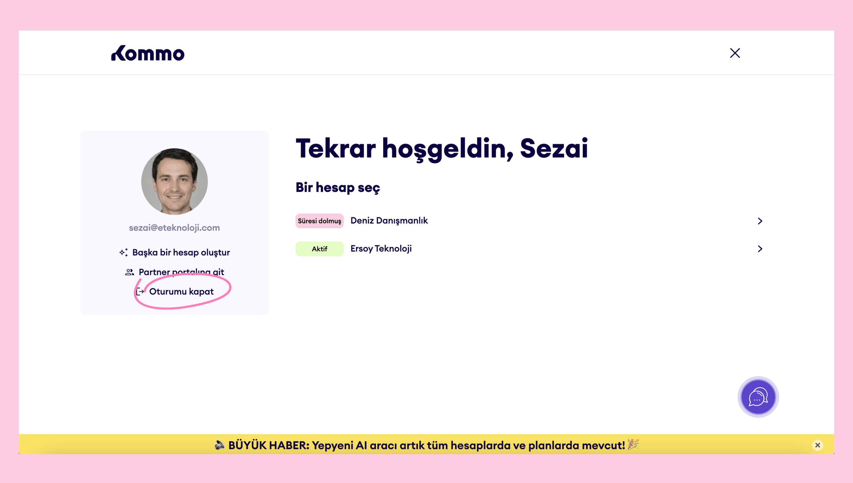 Not: Oturumu kapatmak, kullanıcı olarak Kommo hesabına erişim hakkınızı veya hesabınızı etkilemez. Tekrar oturum açtıktan sonra, kullanıcısı olduğunuz hesaplar Hesaba git sayfasında listelenmeye devam edecektir.