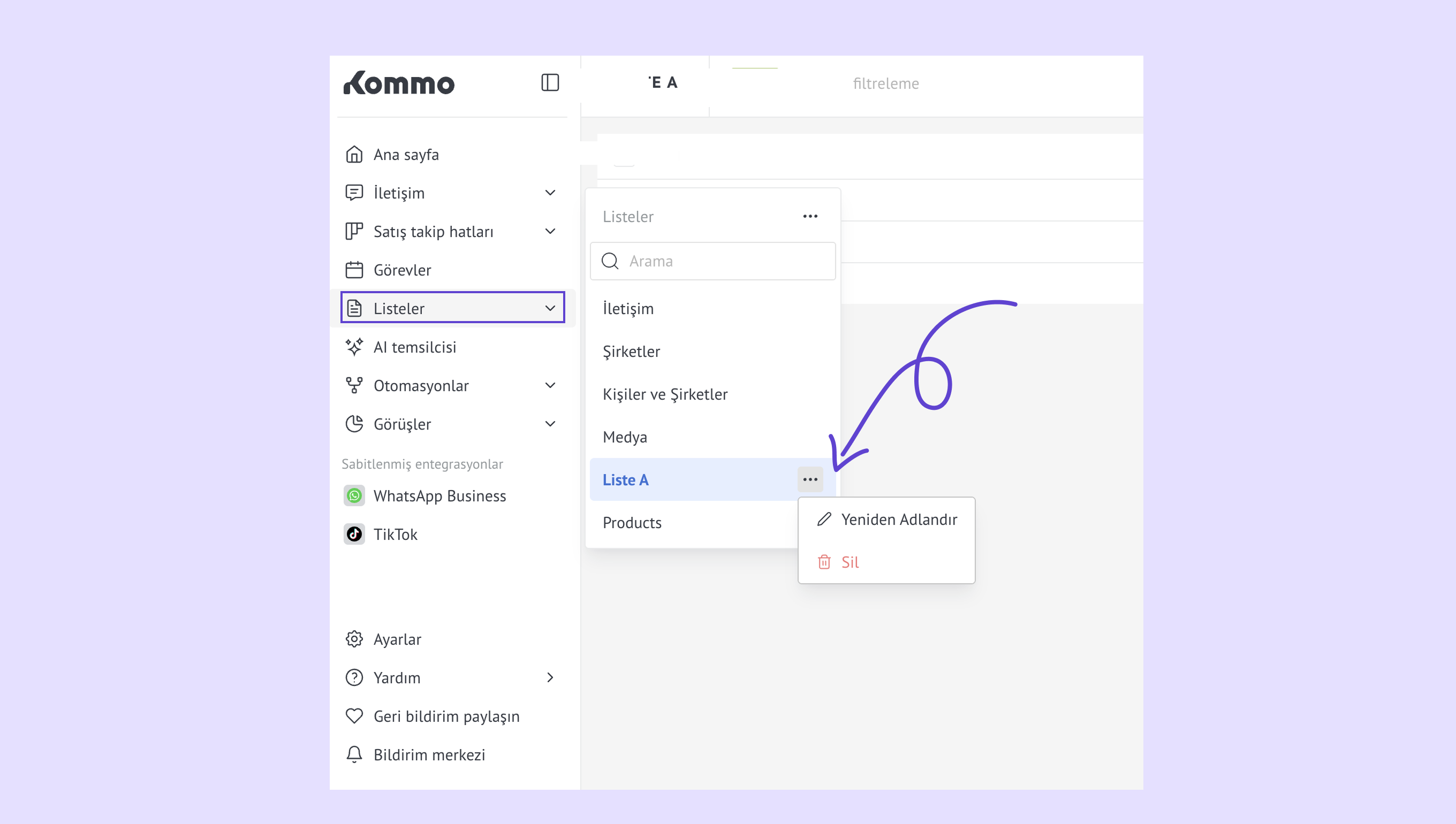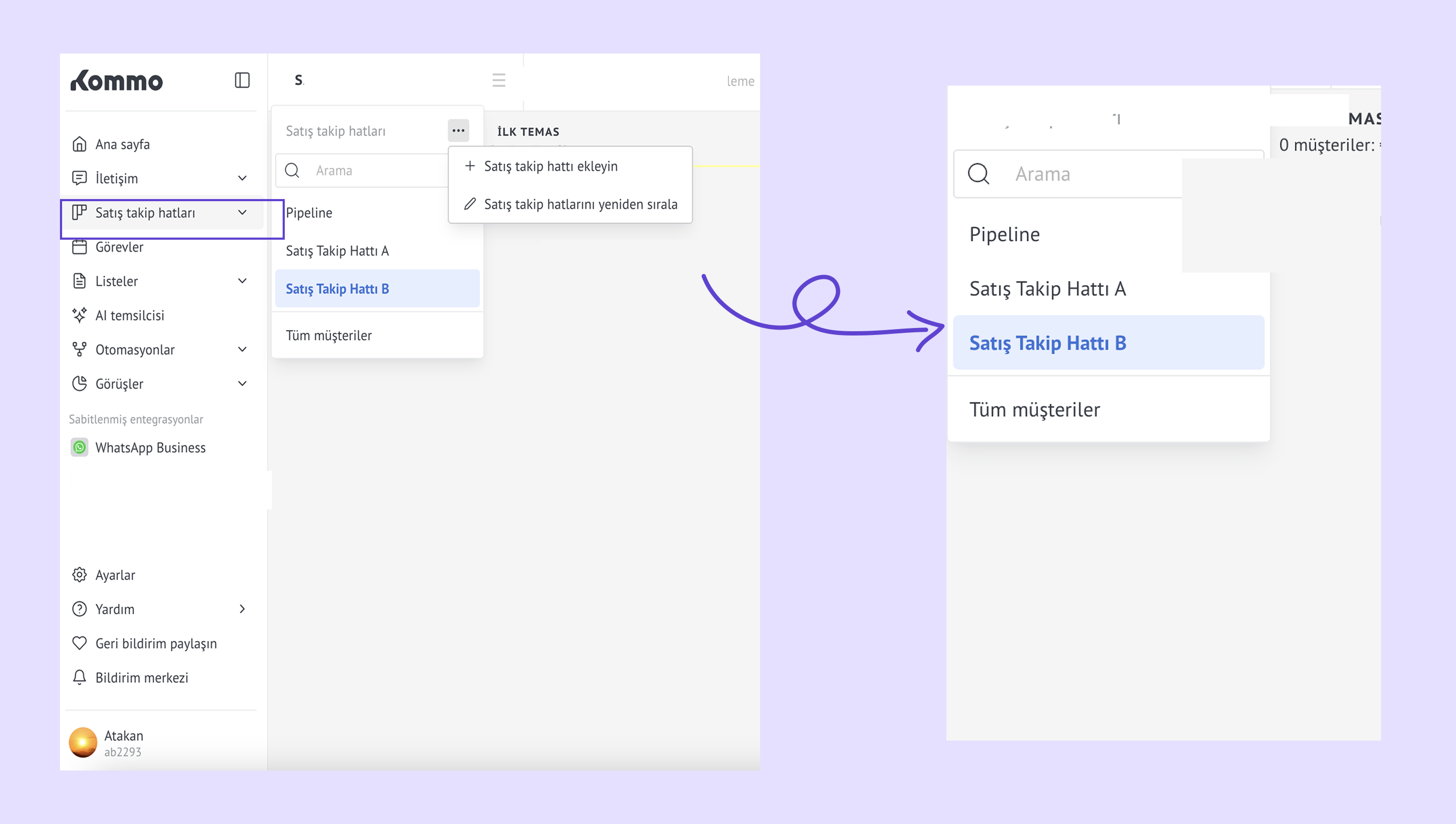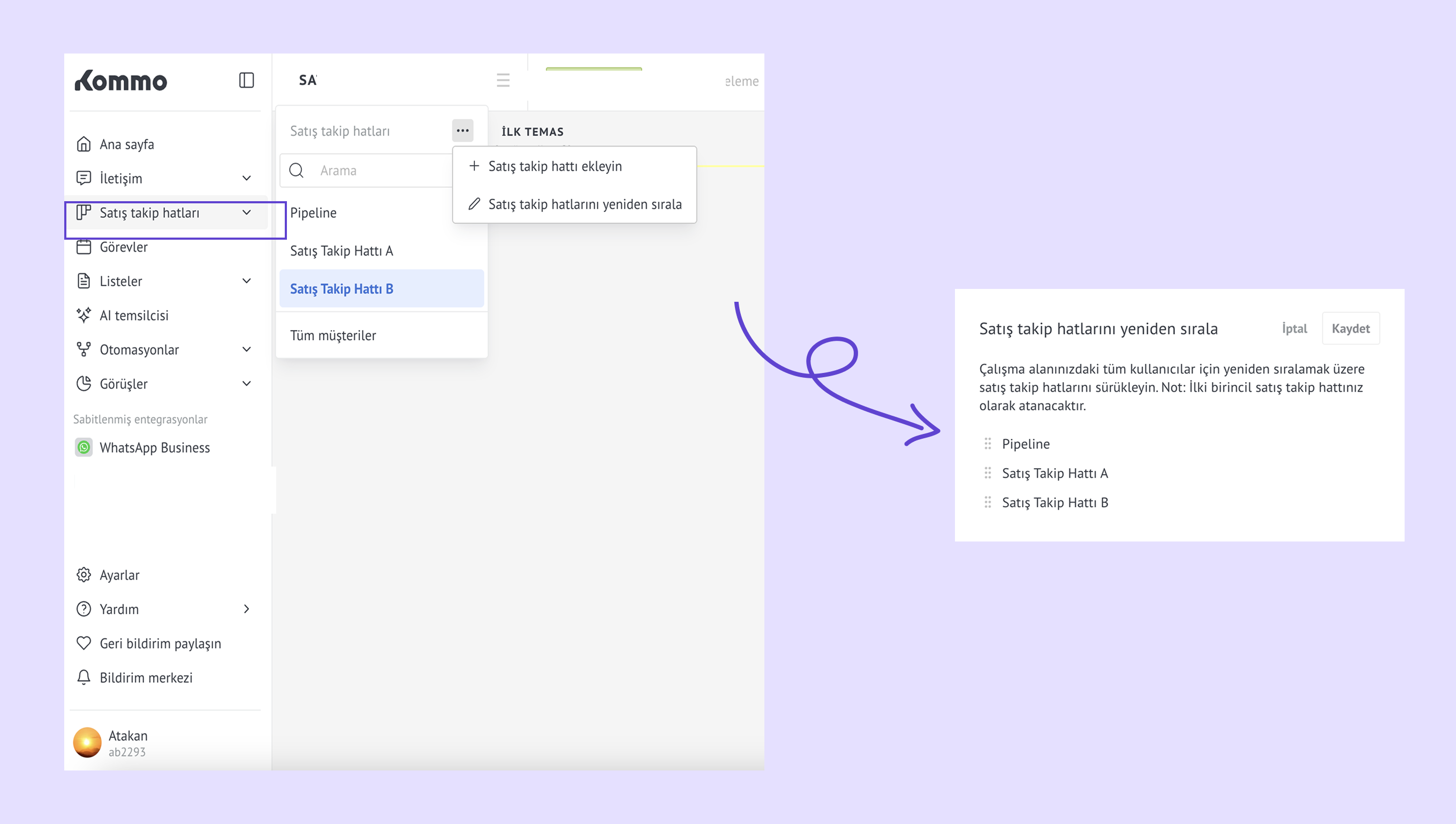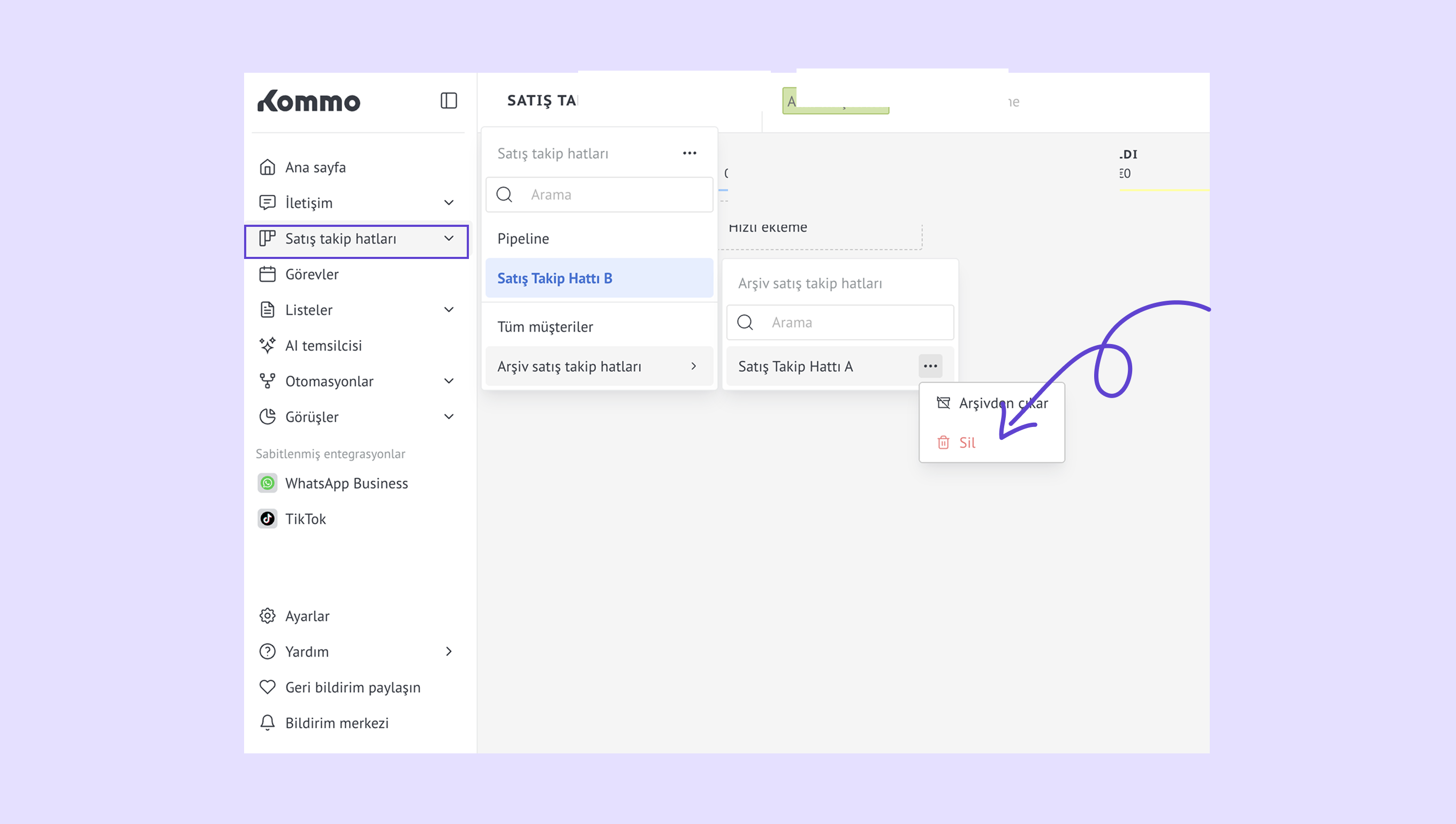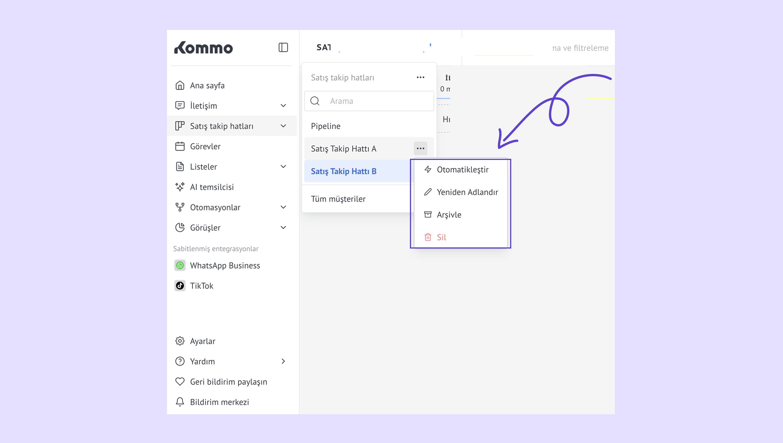 Satış takip hatlarını yönet – bir satış takip hattı adının üzerine gelin ve … menüsünü açarak otomatikleştirin, yeniden adlandırın, arşivleyin veya silin.