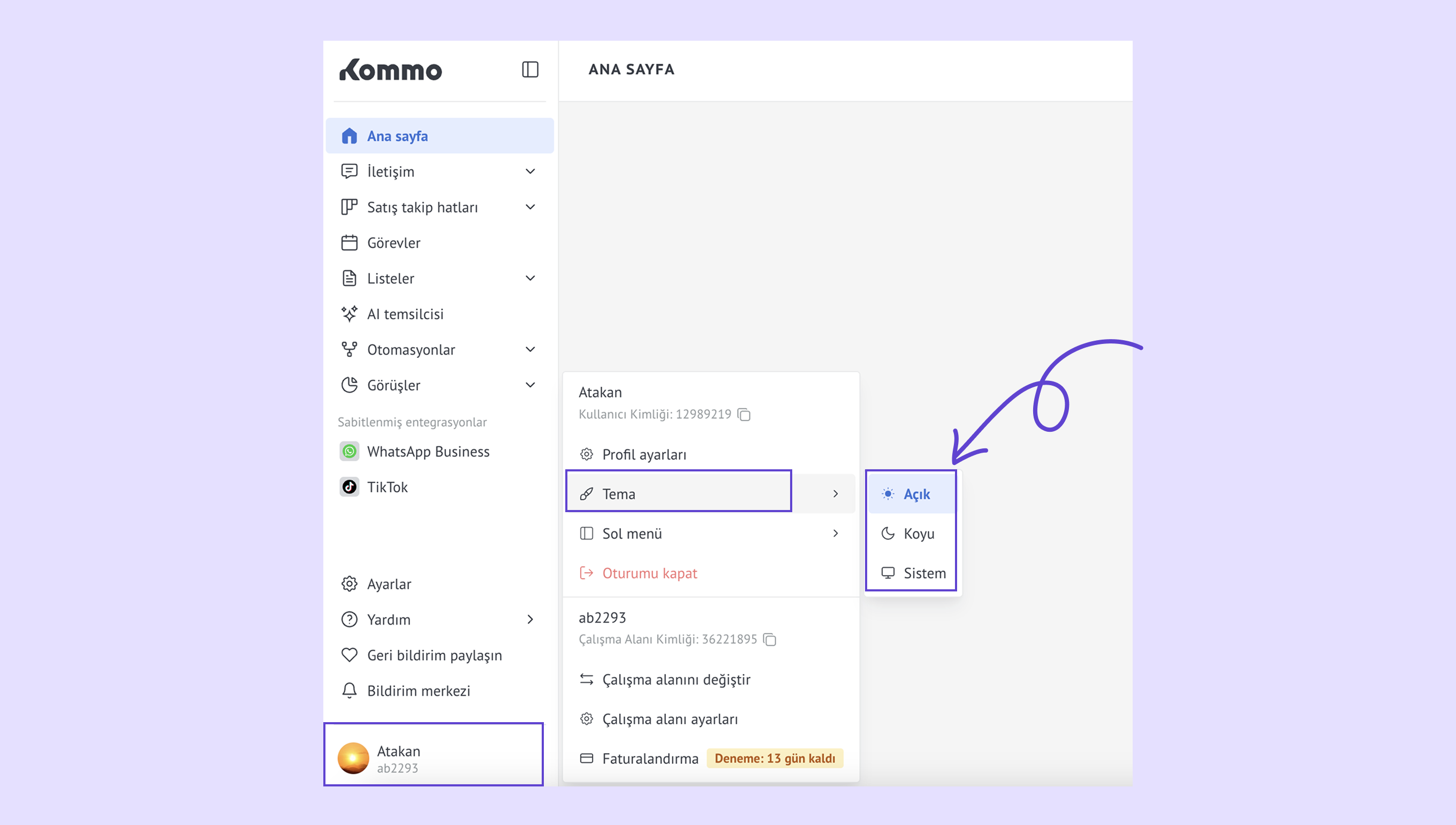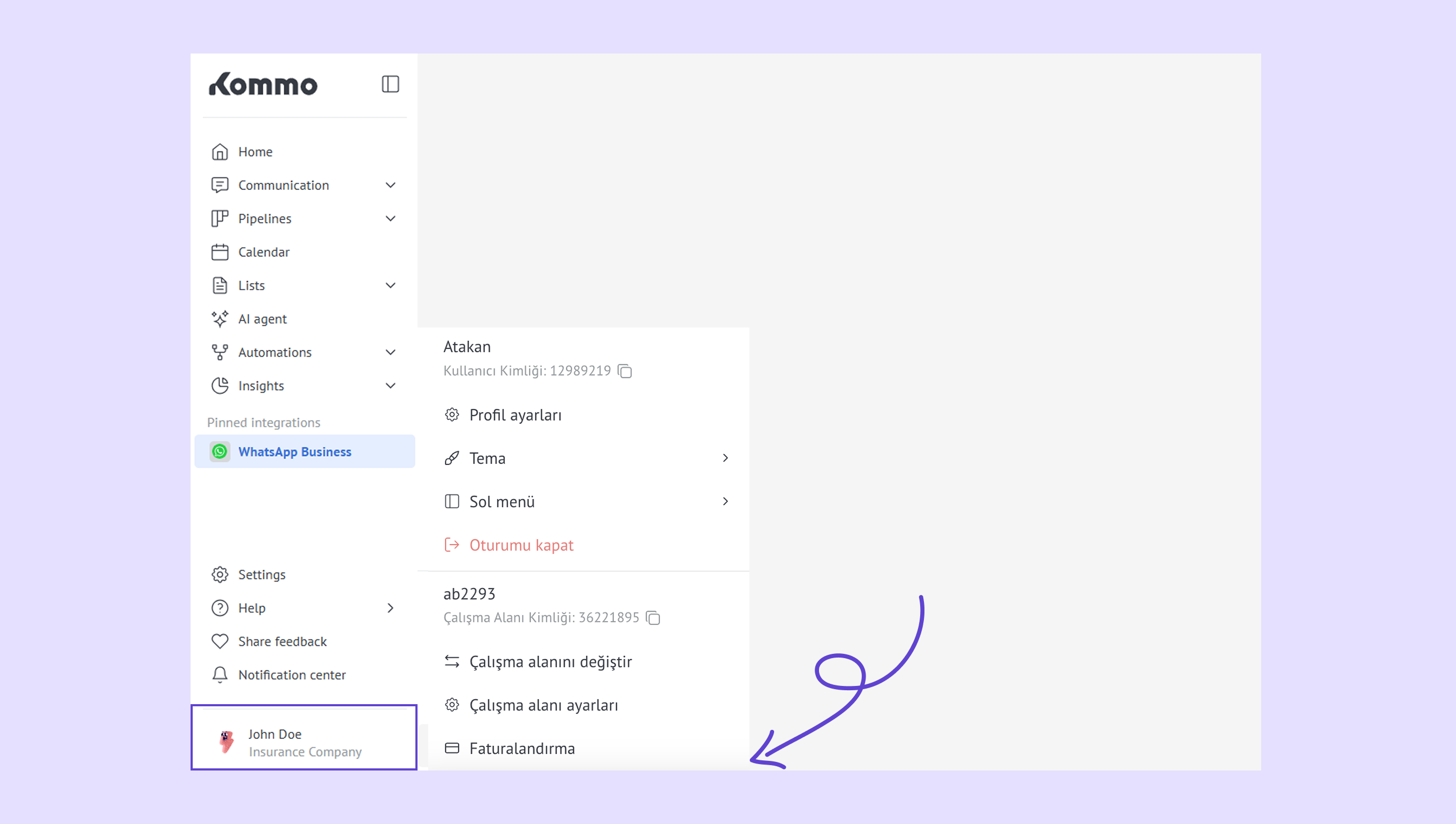 Fatura – Kommo planınızı ve kalan abonelik gün sayınızı görüntüleyin. -