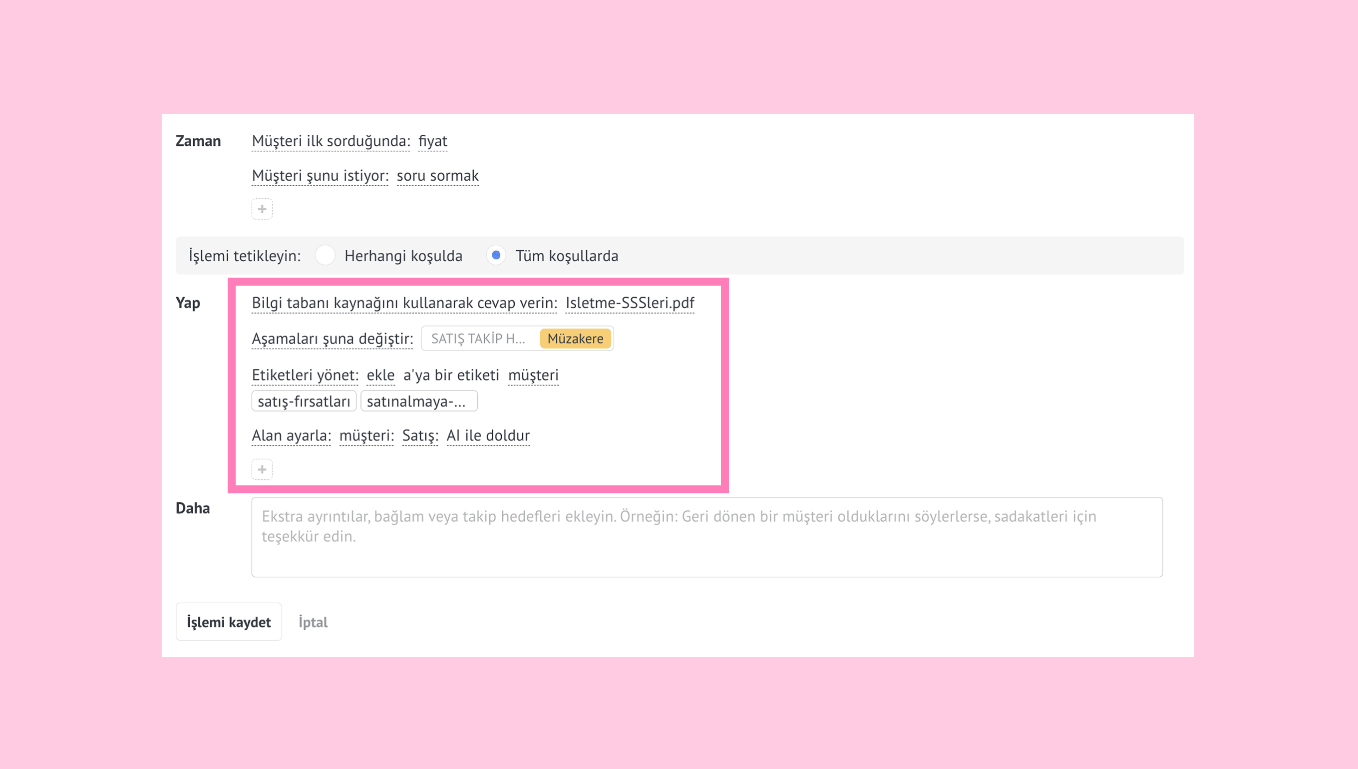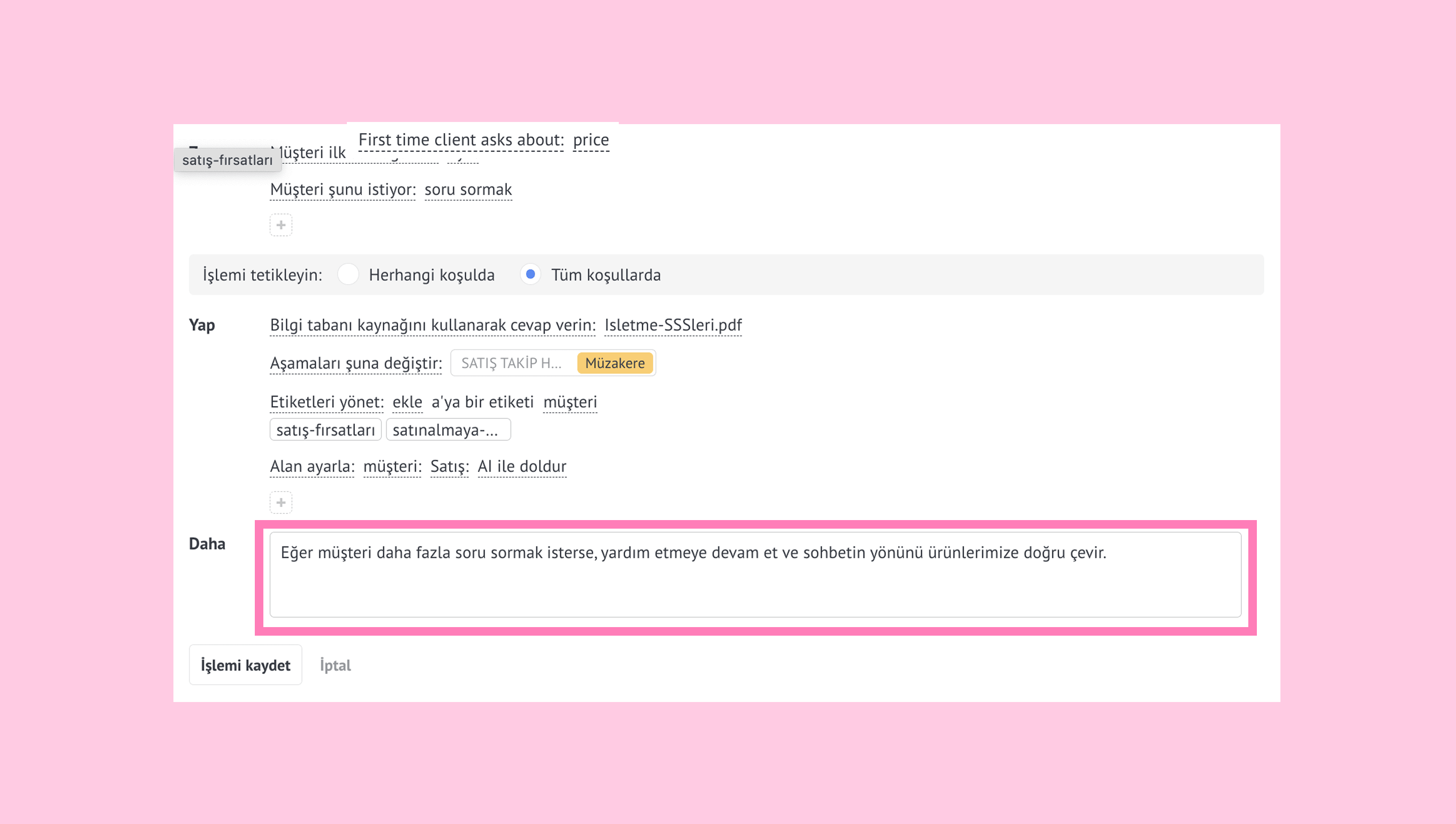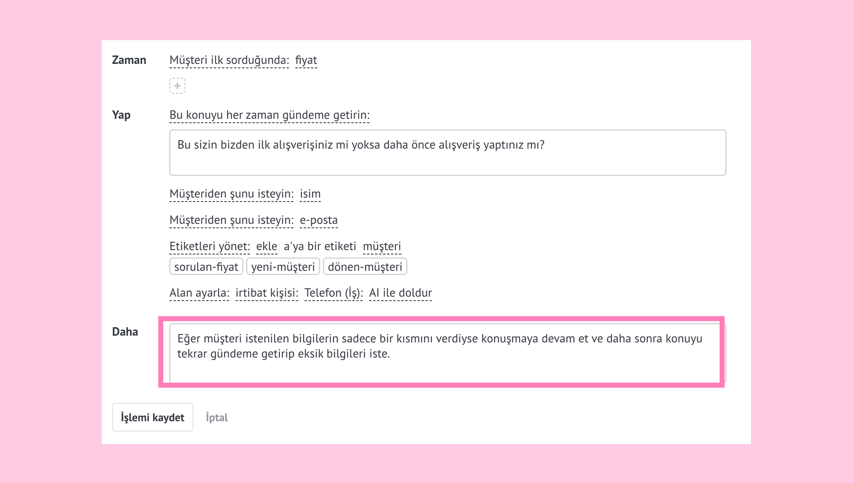 Daha Fazla (isteğe bağlı) - Bir durumun biraz daha netleştirilmesi veya kontrol edilmesi gerektiğinde AI ajanın uyması gereken ek kurallar.