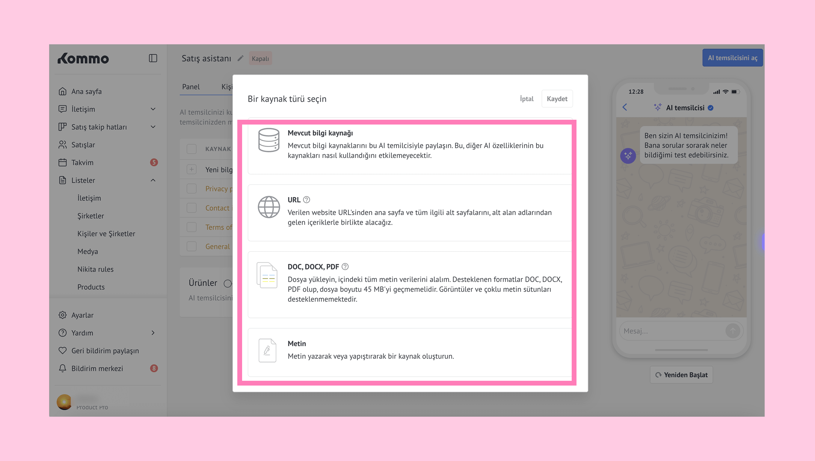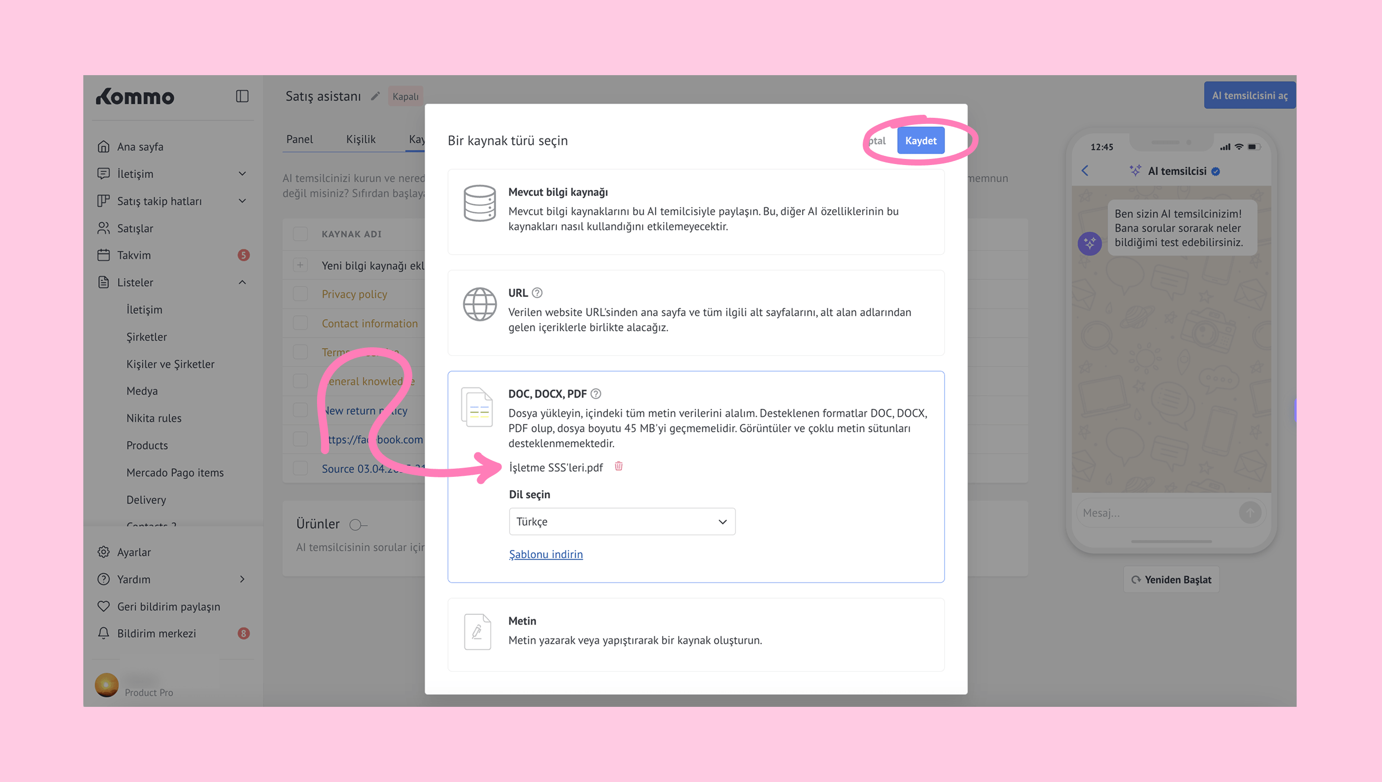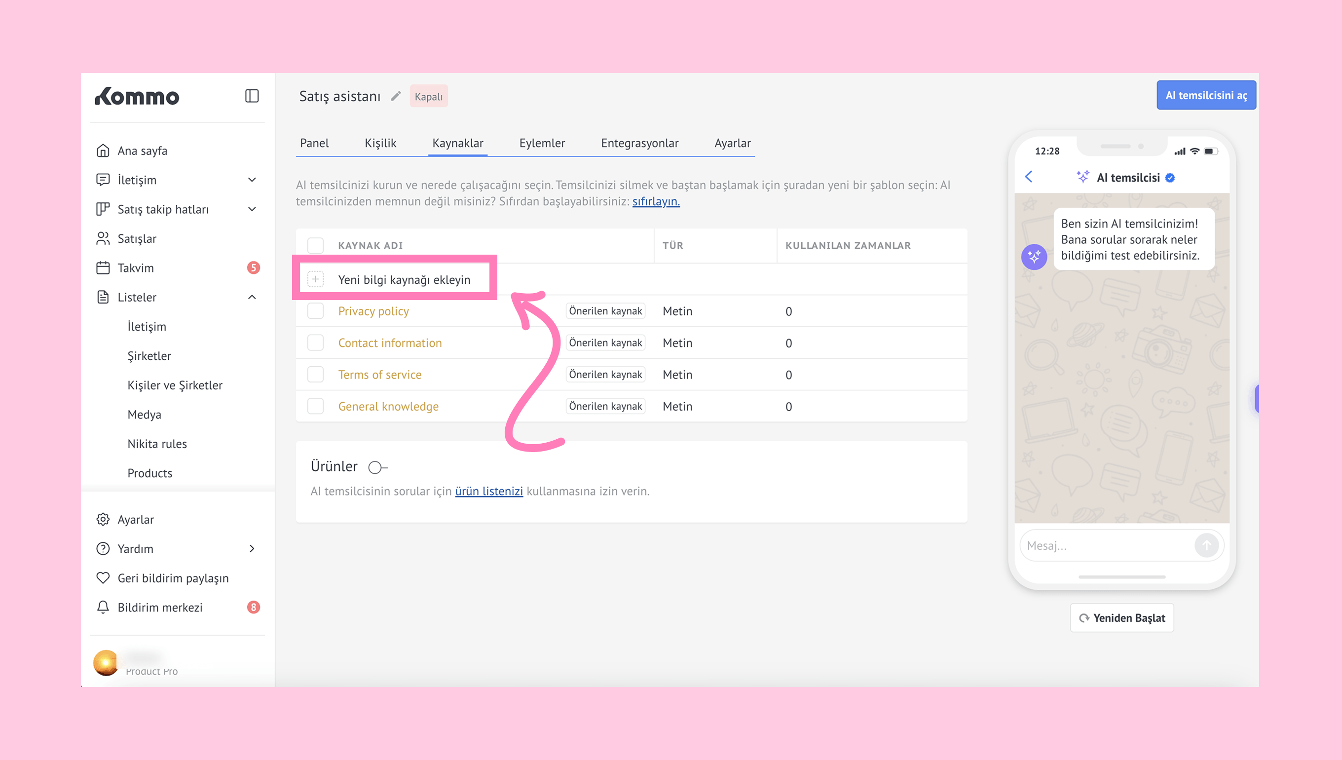 Kaynaklar sekmesine gidin ve işletmenizin SSS'lerini içeren bir bilgi kaynağı ekleyin. Bu kaynak, fiyatlandırma, teslimat süreleri, ödeme yöntemleri veya satış öncesi sık sorulan sorular gibi bilgileri içerebilir.