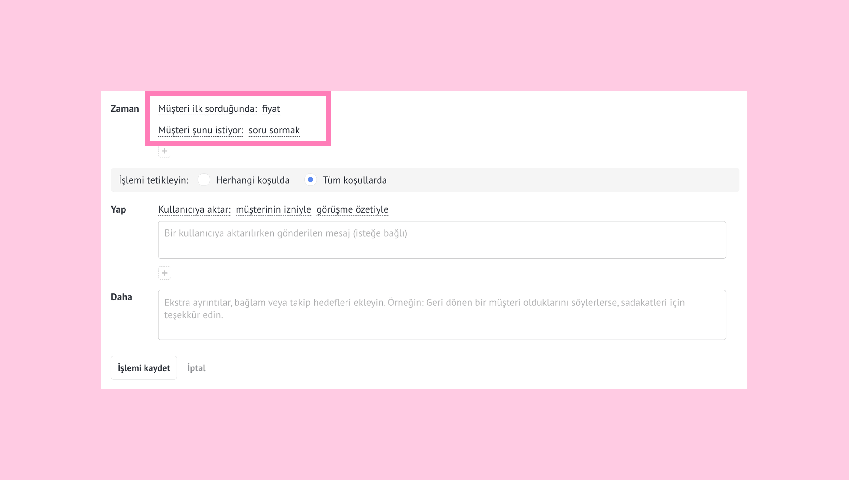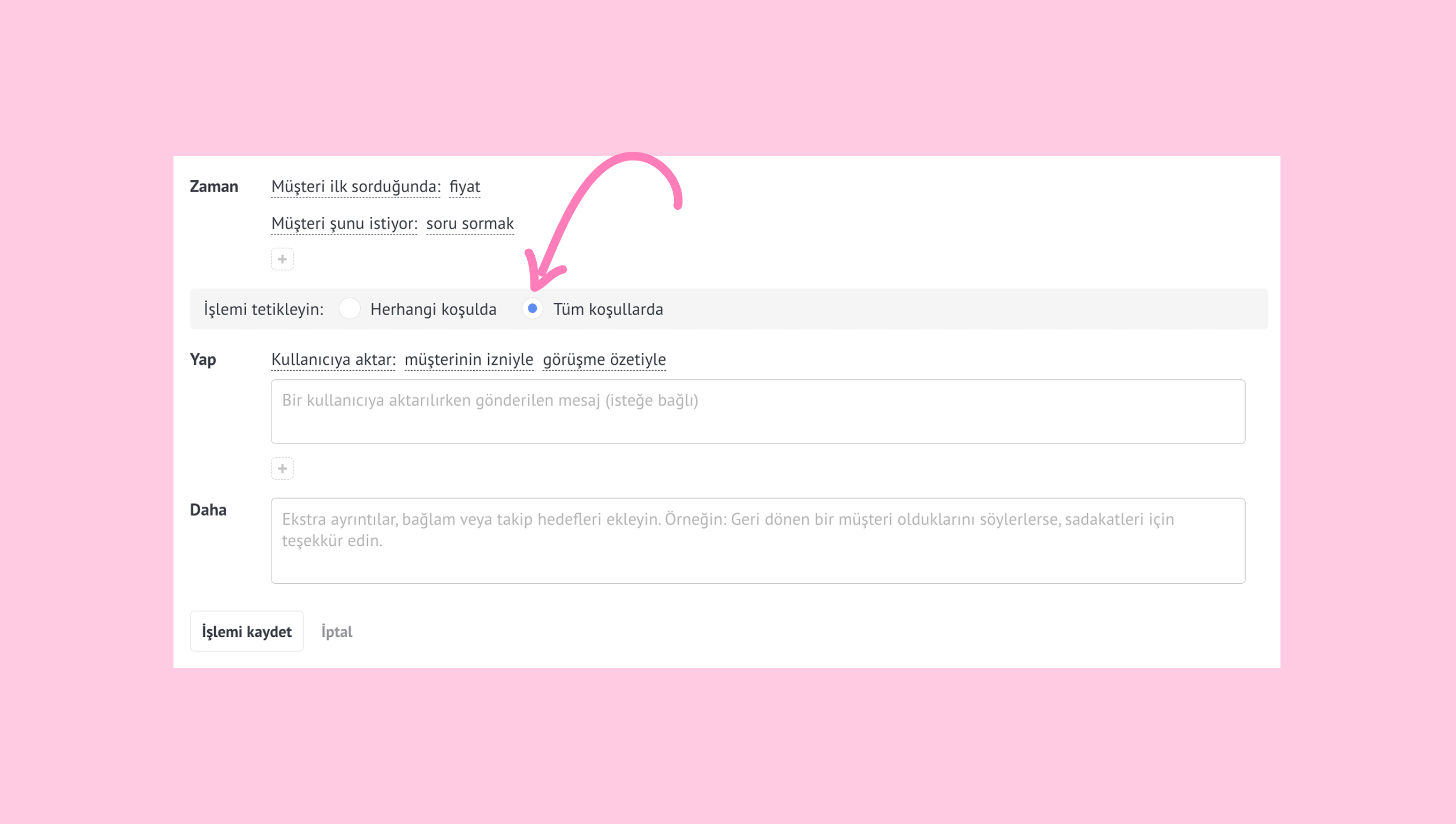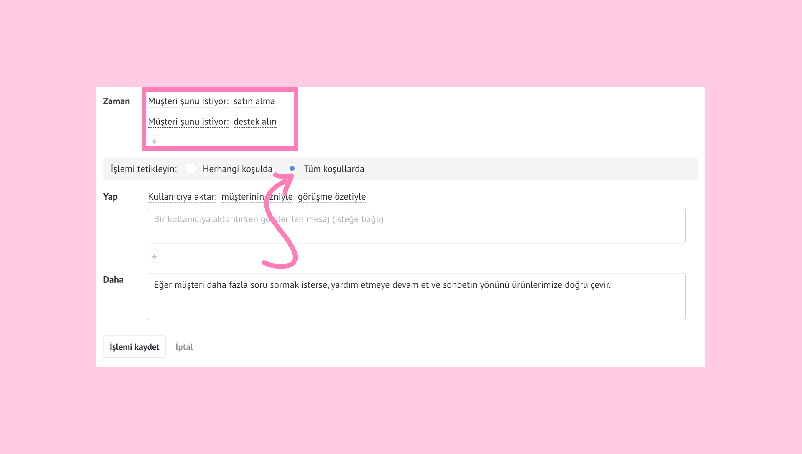 Tüm koşullar karşılandığında eylemi tetiklemek için aşağıdaki seçeneği seçin. Bu, müşteri ilk satın alma niyetini gösterdiğinde ve satış öncesi bir soru sorduğunda eylemin çalıştırılmasını sağlar.
