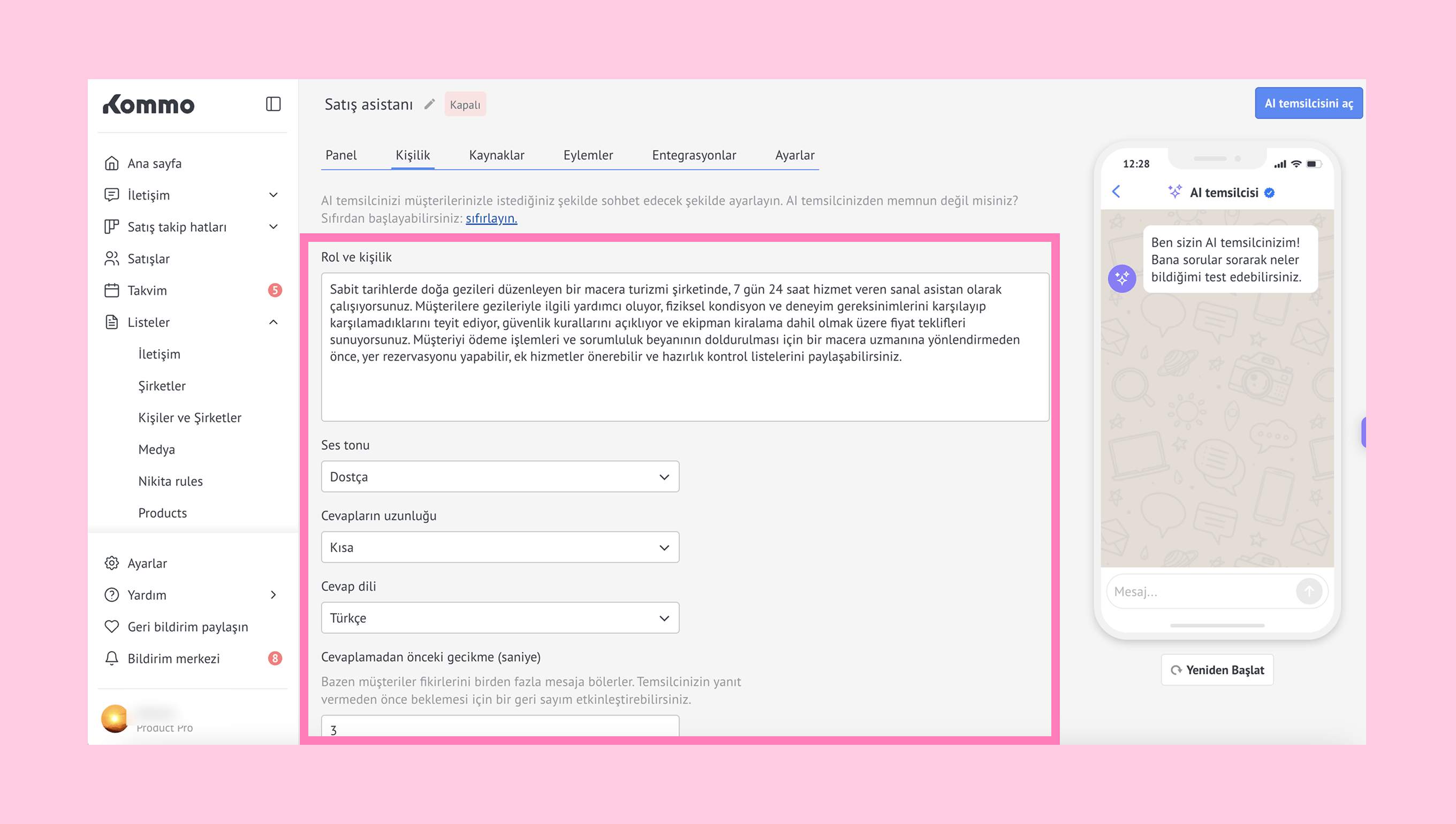 Kişilik sekmesine gidin ve AI ajanın müşterilerinizle nasıl iletişim kuracağını ayarlayın. Aşağıdaki alanları yapılandırın: