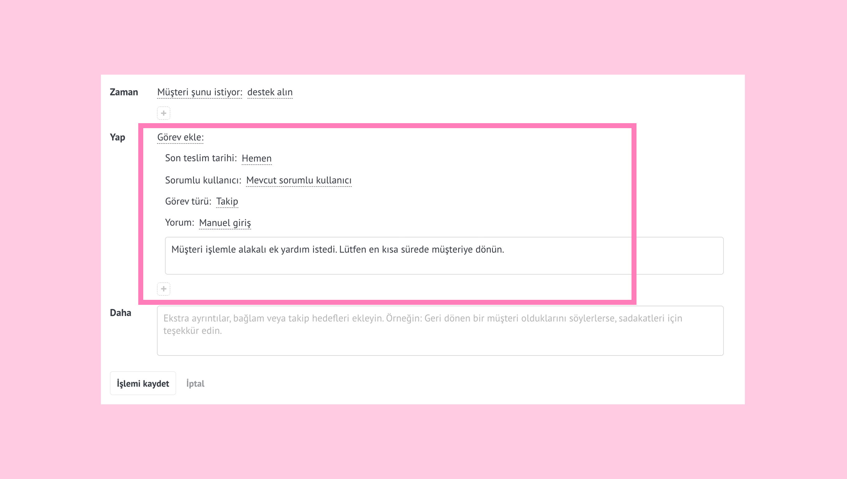 YAP eylemi için, Görev ekle seçeneğini seçerek potansiyel müşterinin sorumlu kullanıcısı adına bir görev oluşturun; böylece kullanıcı en kısa sürede konuyu takip edebilir. Müşterinin hangi konuda yardıma ihtiyacı olduğunu açıklayan kısa bir görev notu ekleyin; örneğin: 'Müşteri, bir satın alma işlemiyle ilgili ek destek talep etti. Lütfen en kısa sürede konuyu takip edin'.