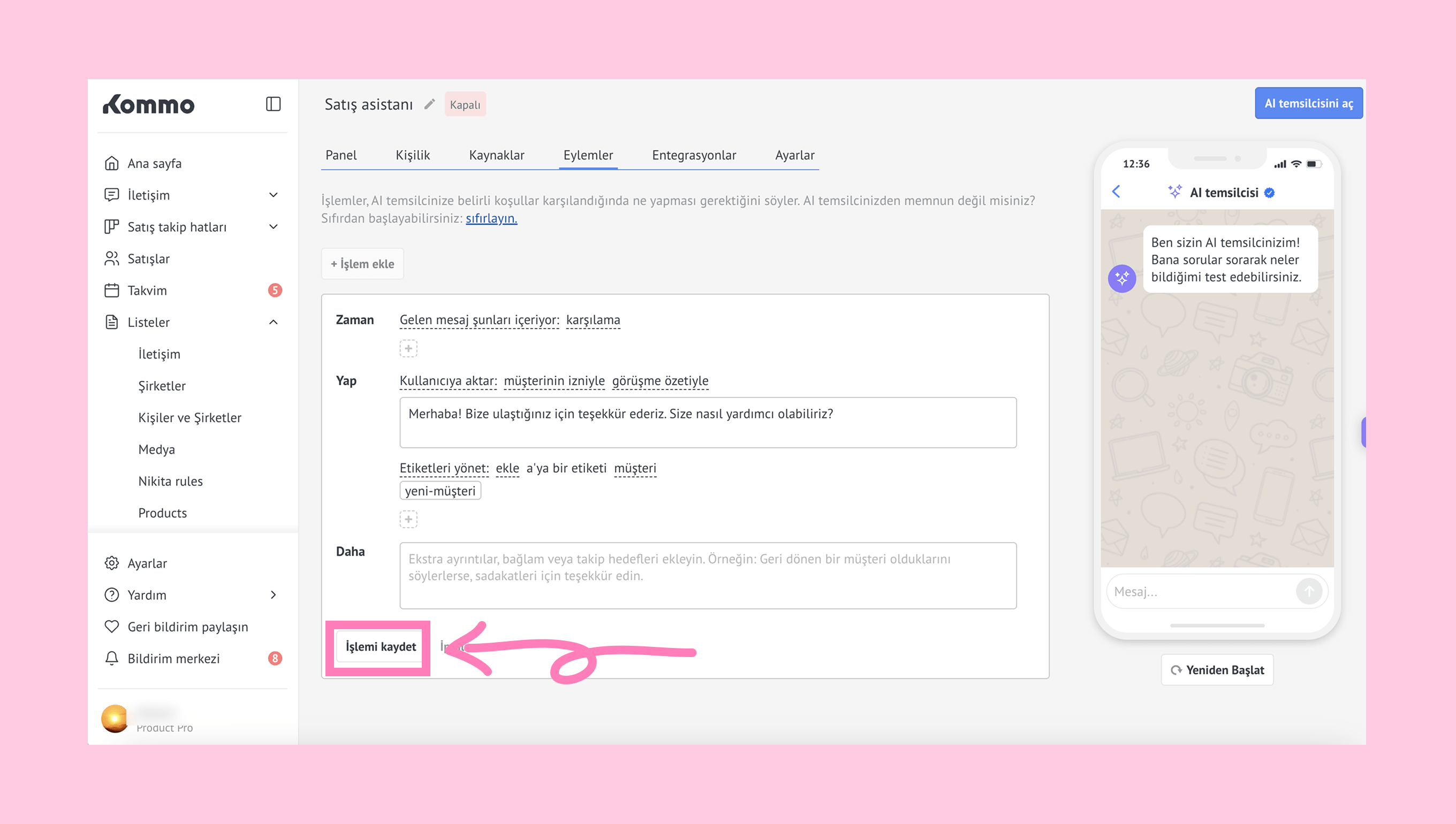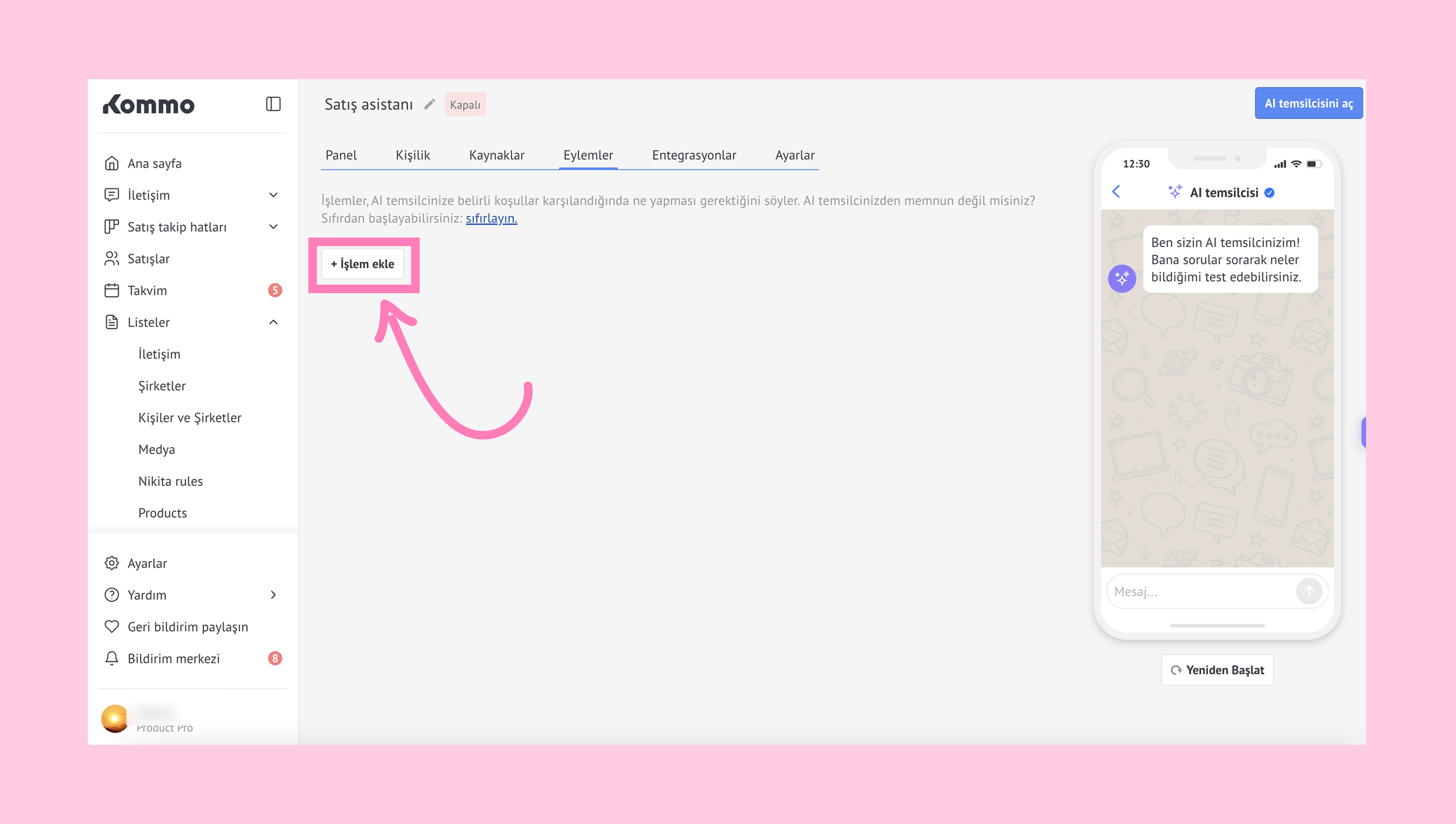 İşlemler sekmesine gidin ve + İşlem ekle seçeneğine tıklayarak bir eylem oluşturun.