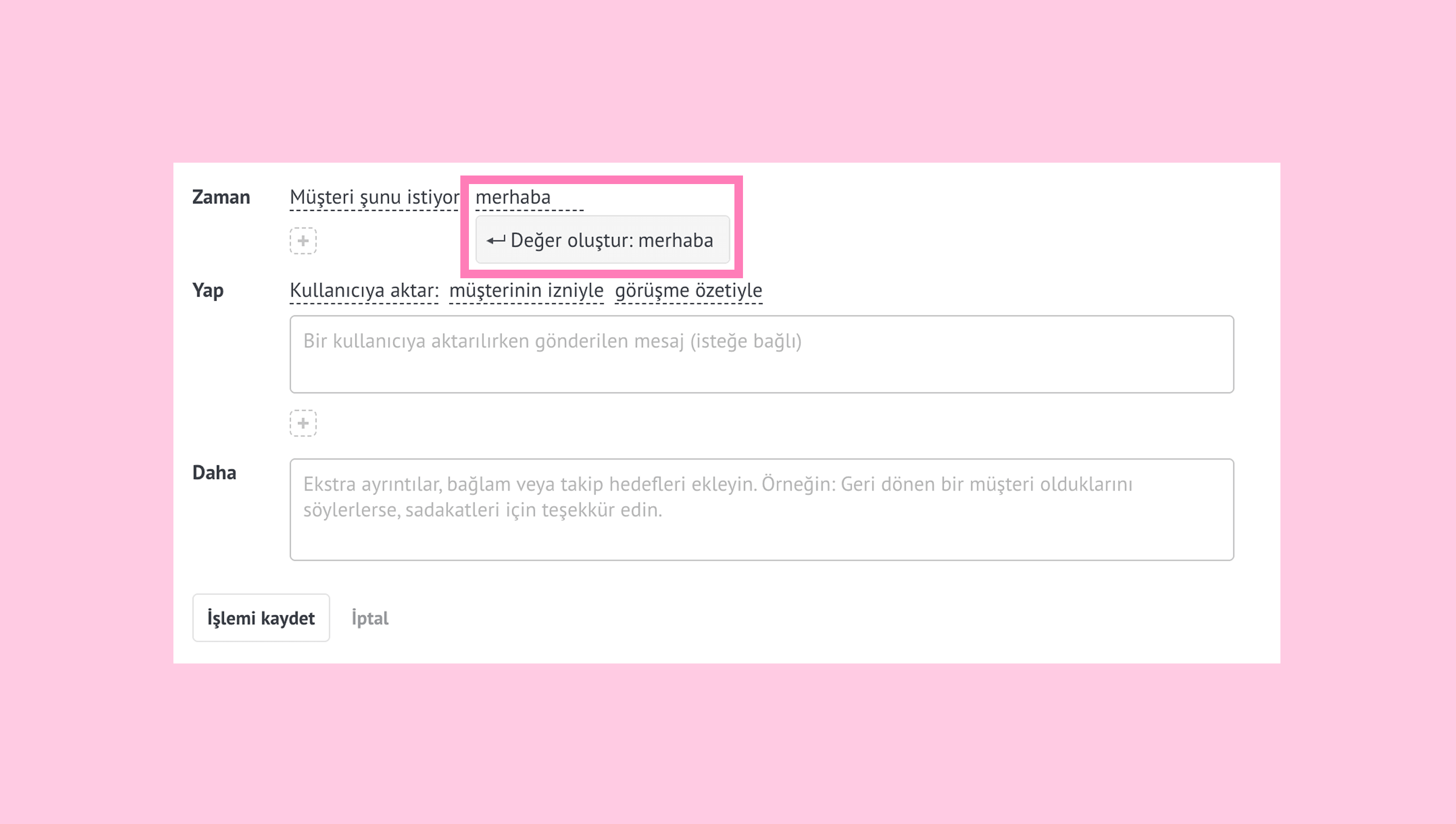 Kendi özel WHEN koşulunuzu manuel olarak yazıp Enter tuşuna basarak kaydedebilirsiniz. Örneğin: hello veya hi there. gibi ifadeler ekleyin.