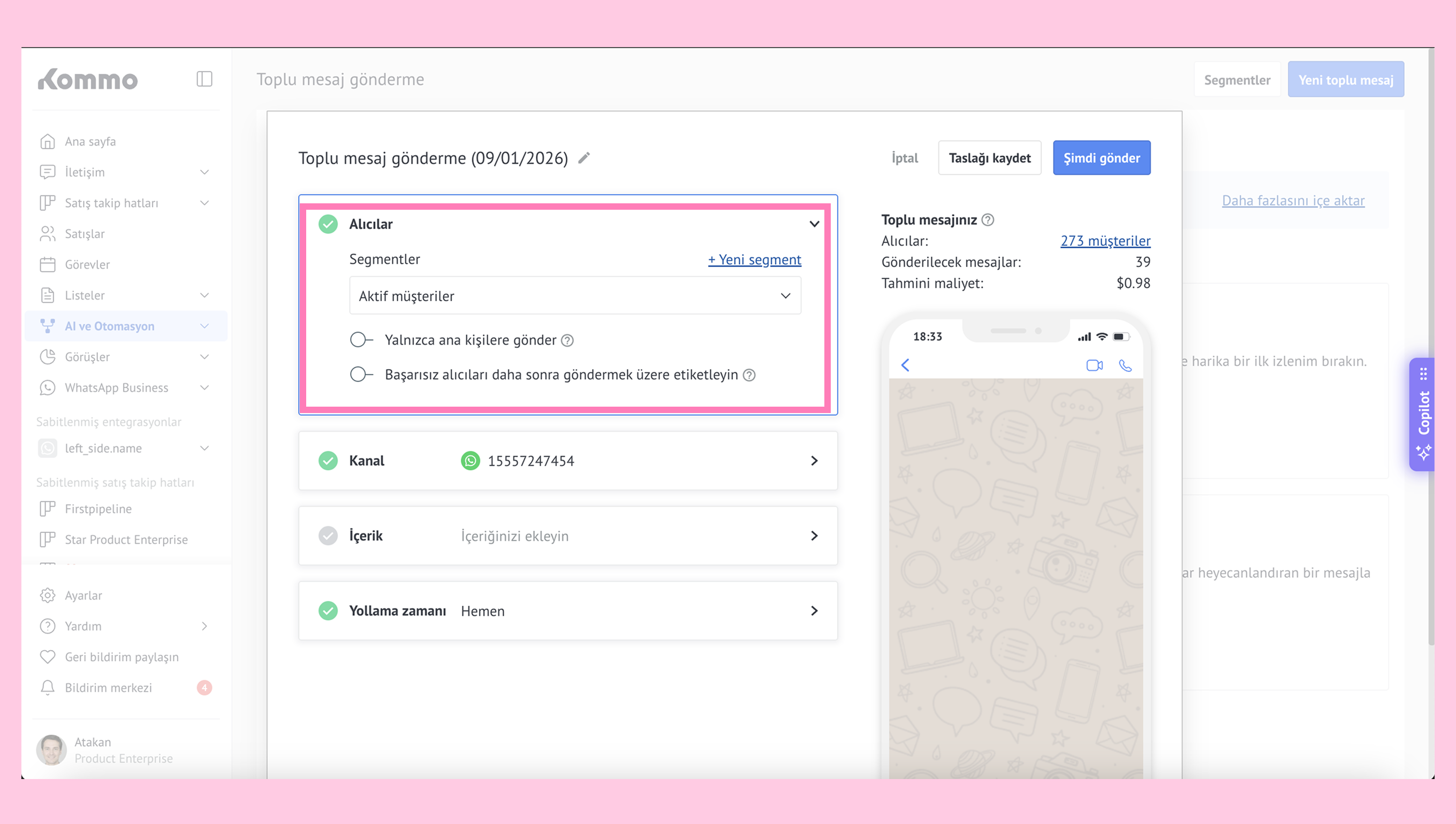 WhatsApp veya Kommo şablonlarını kullanabilir ya da kendi mesajınızı oluşturabilirsiniz. Bu durumda ön onay gerekmez.