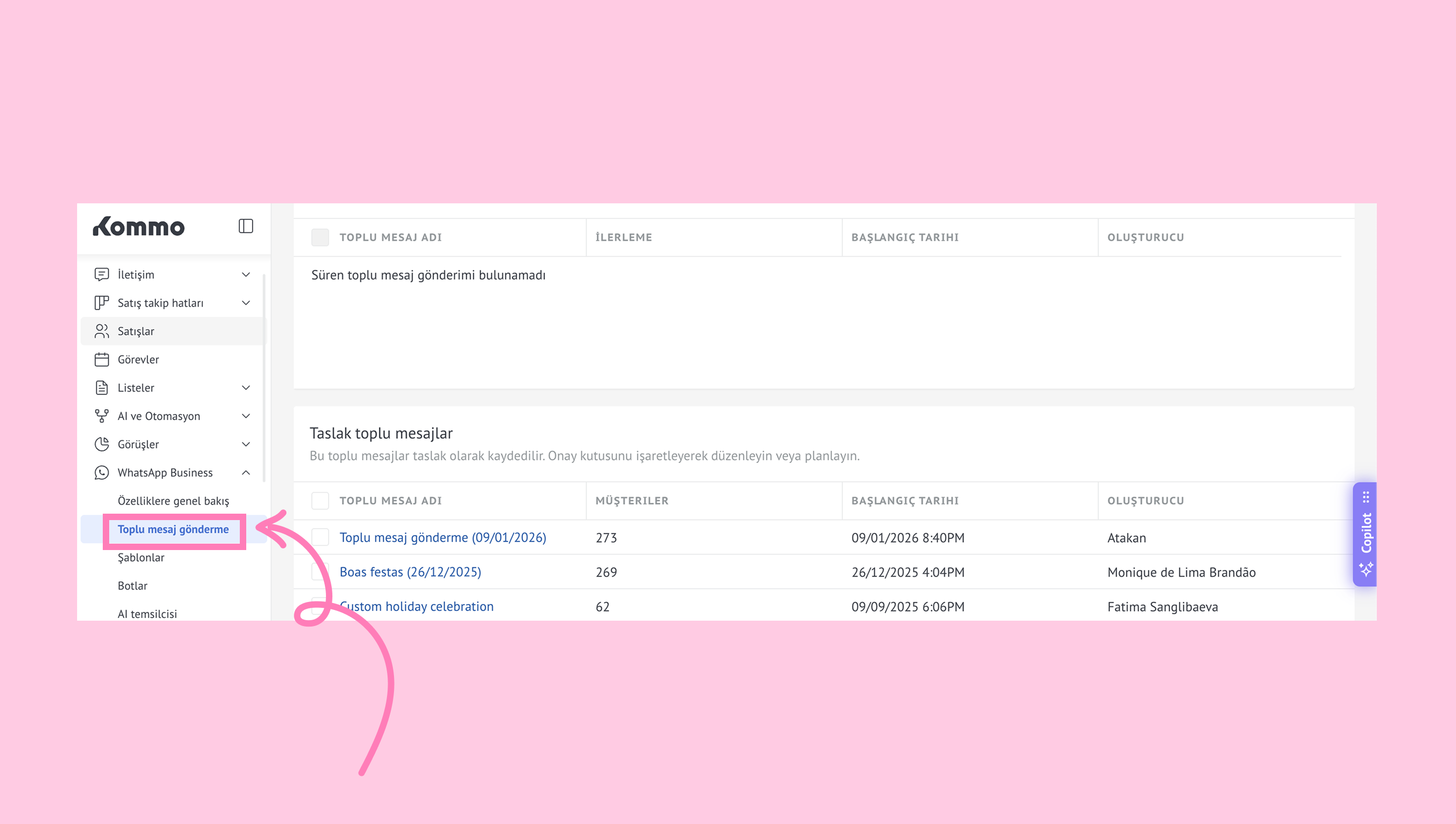 Daha fazla bilgi için: Kommo’da toplu mesajları kurun ve özelleştirin