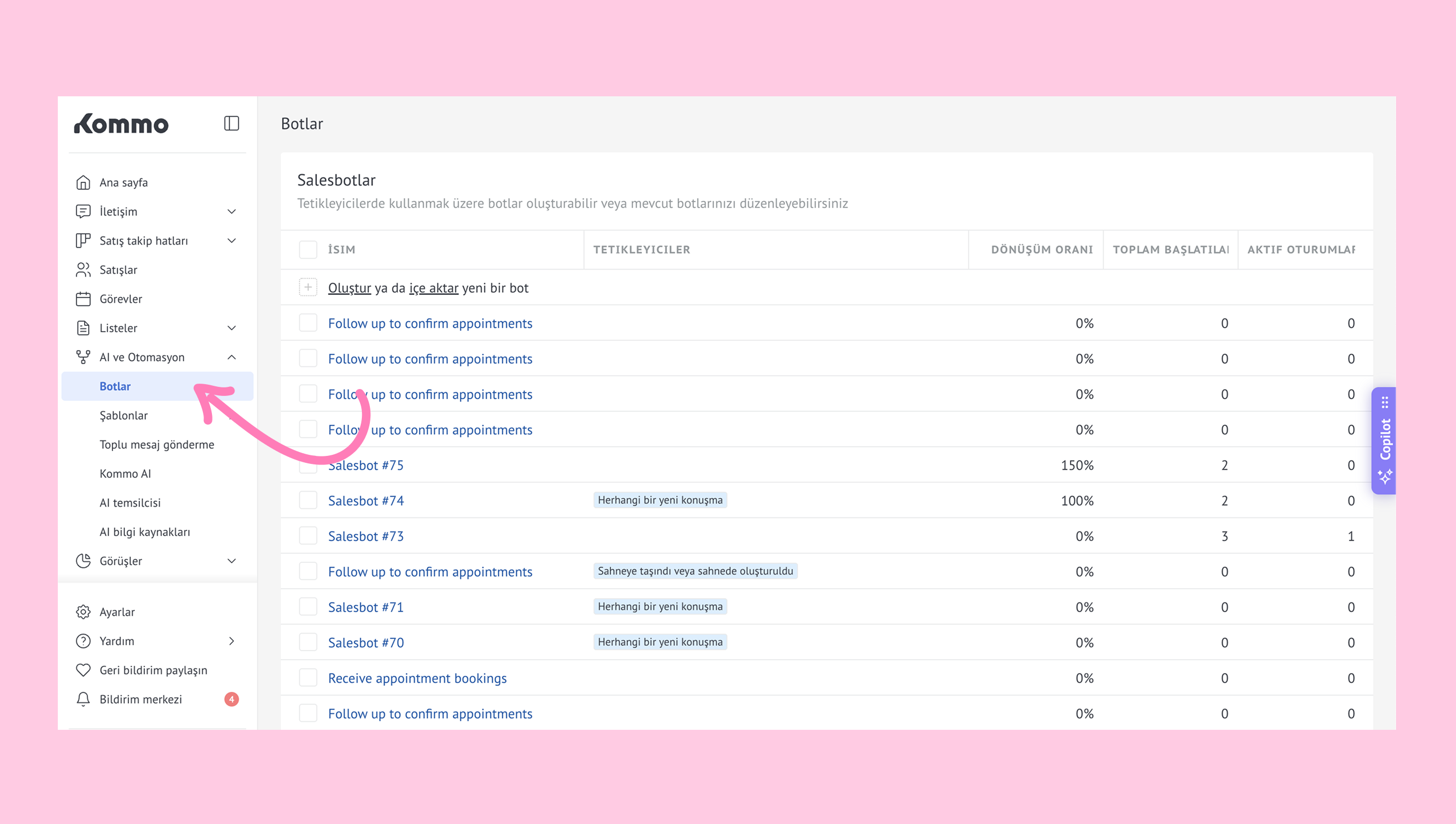Kommo’da bot oluşturma hakkında daha fazla bilgi edinmek için, Salesbot nasıl oluşturulur makalemizi okuyabilirsiniz.