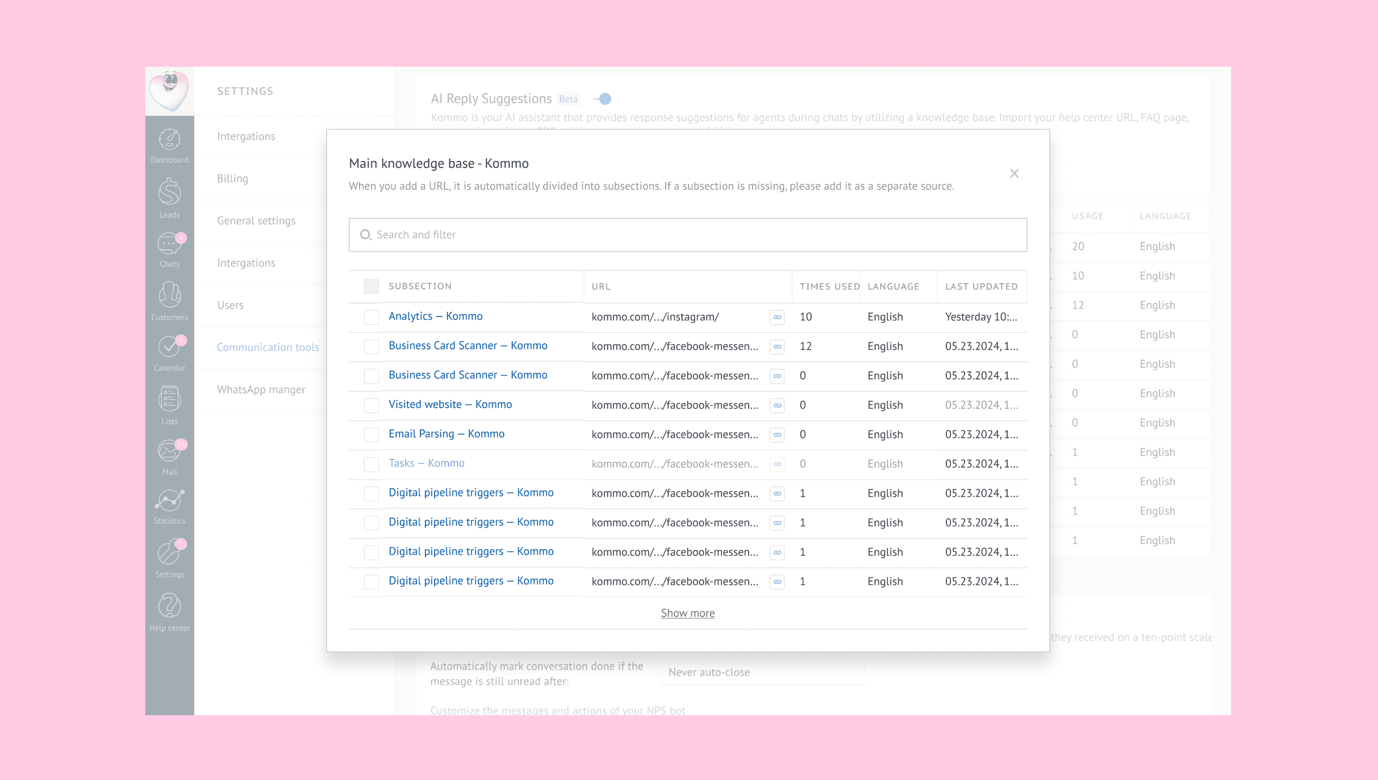 Bu üç bölümü yapılandırarak, Kommo AI’yi iş ihtiyaçlarınıza uygun hale getirebilir ve müşteri ile potansiyel müşteri iletişiminizi daha verimli ve etkili hale getirebilirsiniz.