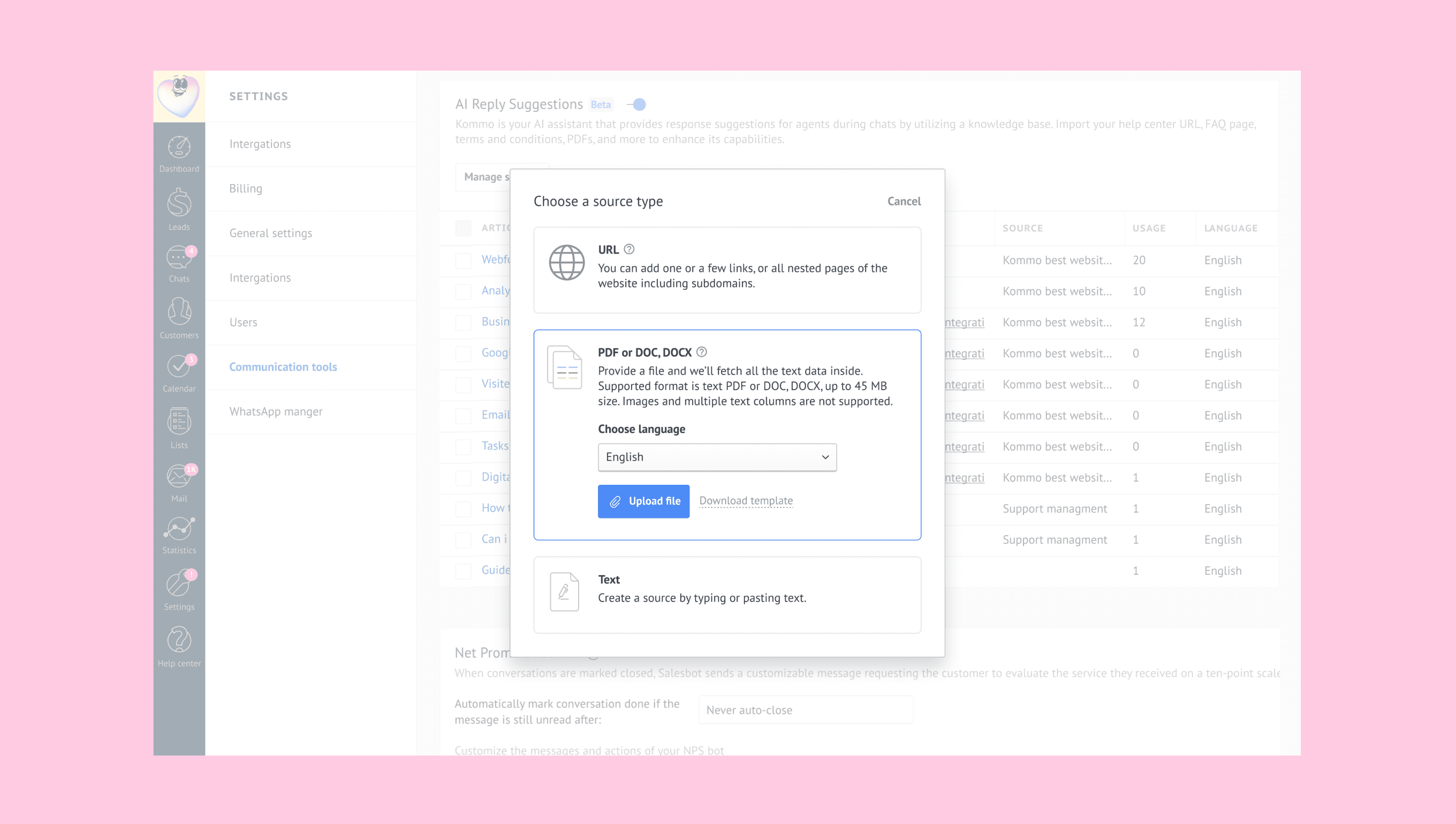 Yüklemeye hazır bir veri kaynağınız yok mu? Kommo AI Önerilen Yanıt özelliğini kullanmaya başlamanızı kolaylaştırmak için özelleştirilebilir bir şablon sunuyoruz. Bu şablonu kullanarak kendi veri kaynağınızı oluşturabilir veya sistemi test edebilirsiniz.
