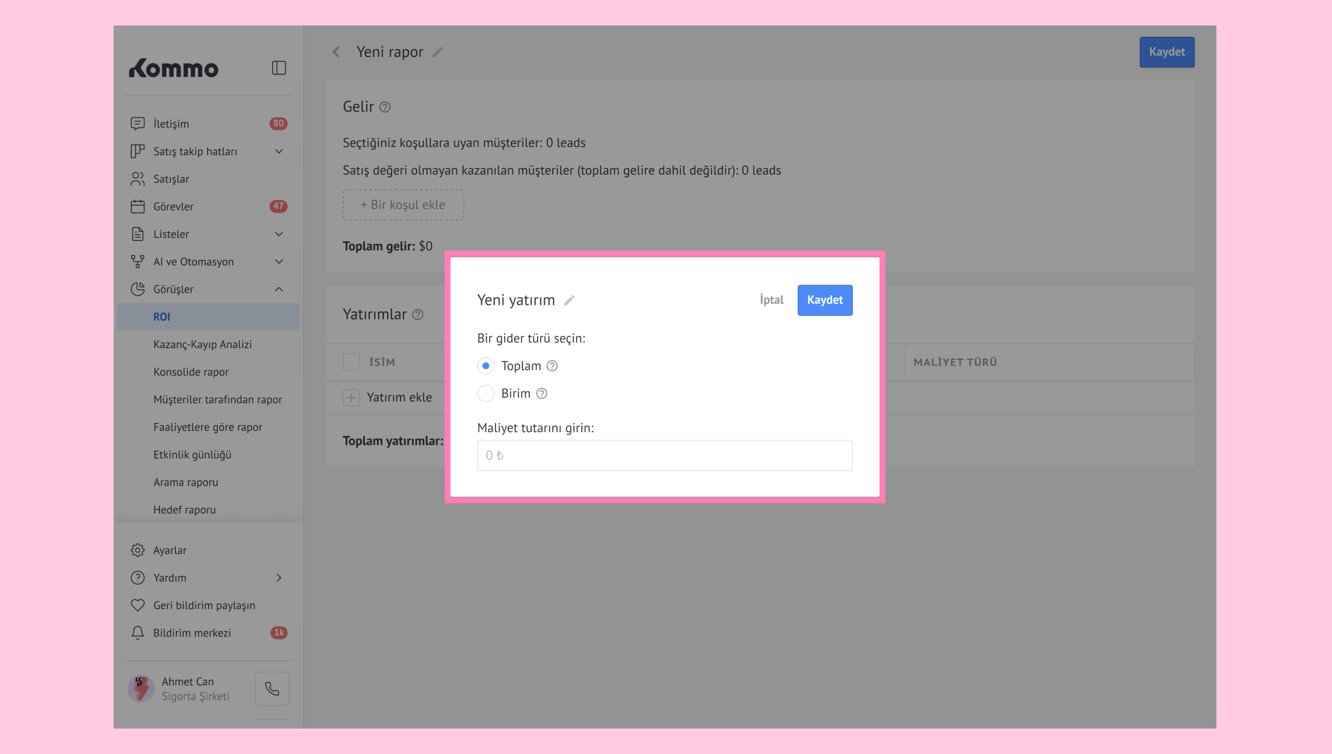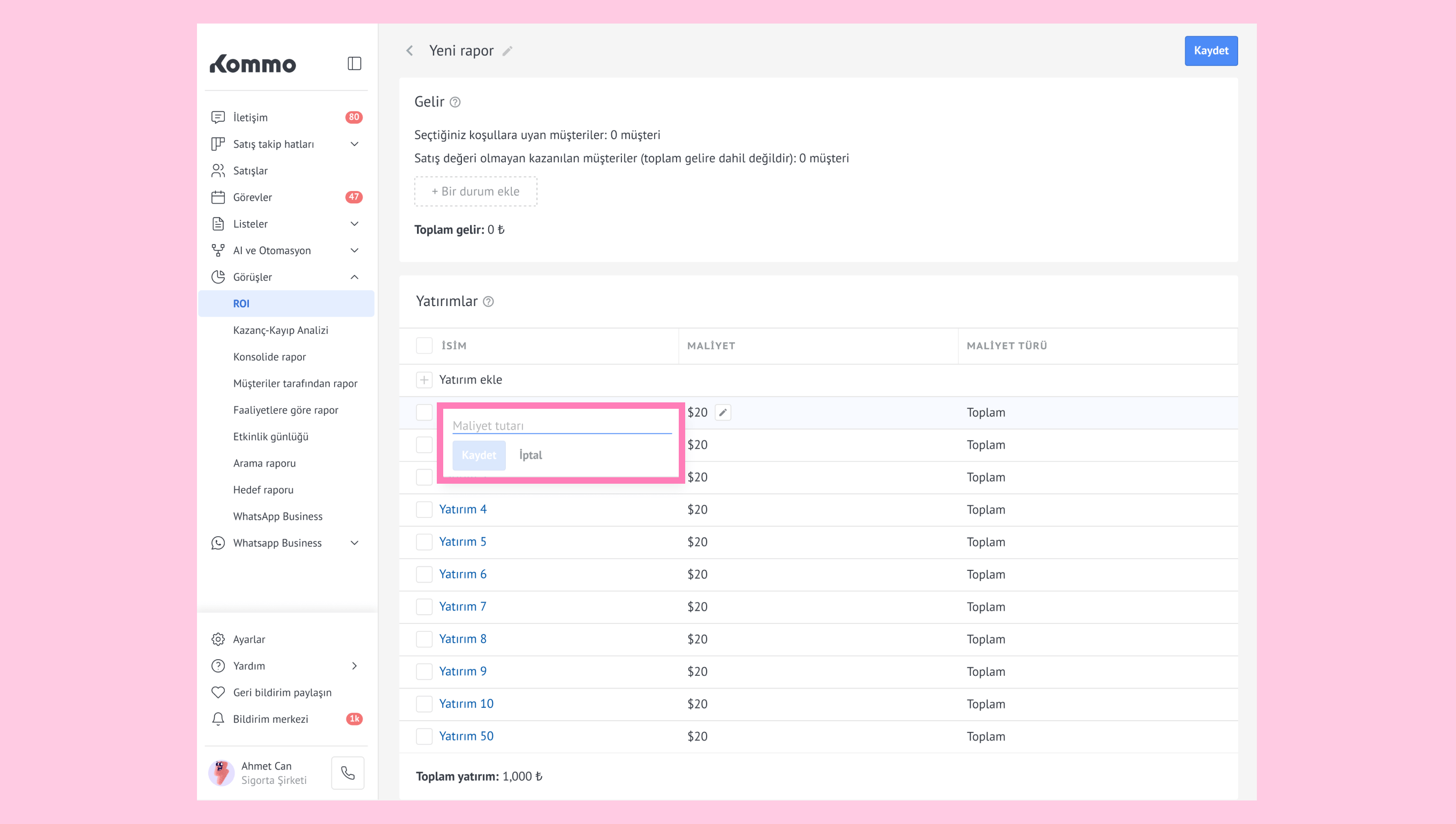 Birim: Tüm filtrelenmiş örnekleminize uygulanan müşteri başına maliyet. (Örneğin: Raporunuz 50 müşteri içeriyorsa ve Birim = 5$ olarak ayarlarsanız, Kommo 50 × 5 = 250$ işlemini yapar.)