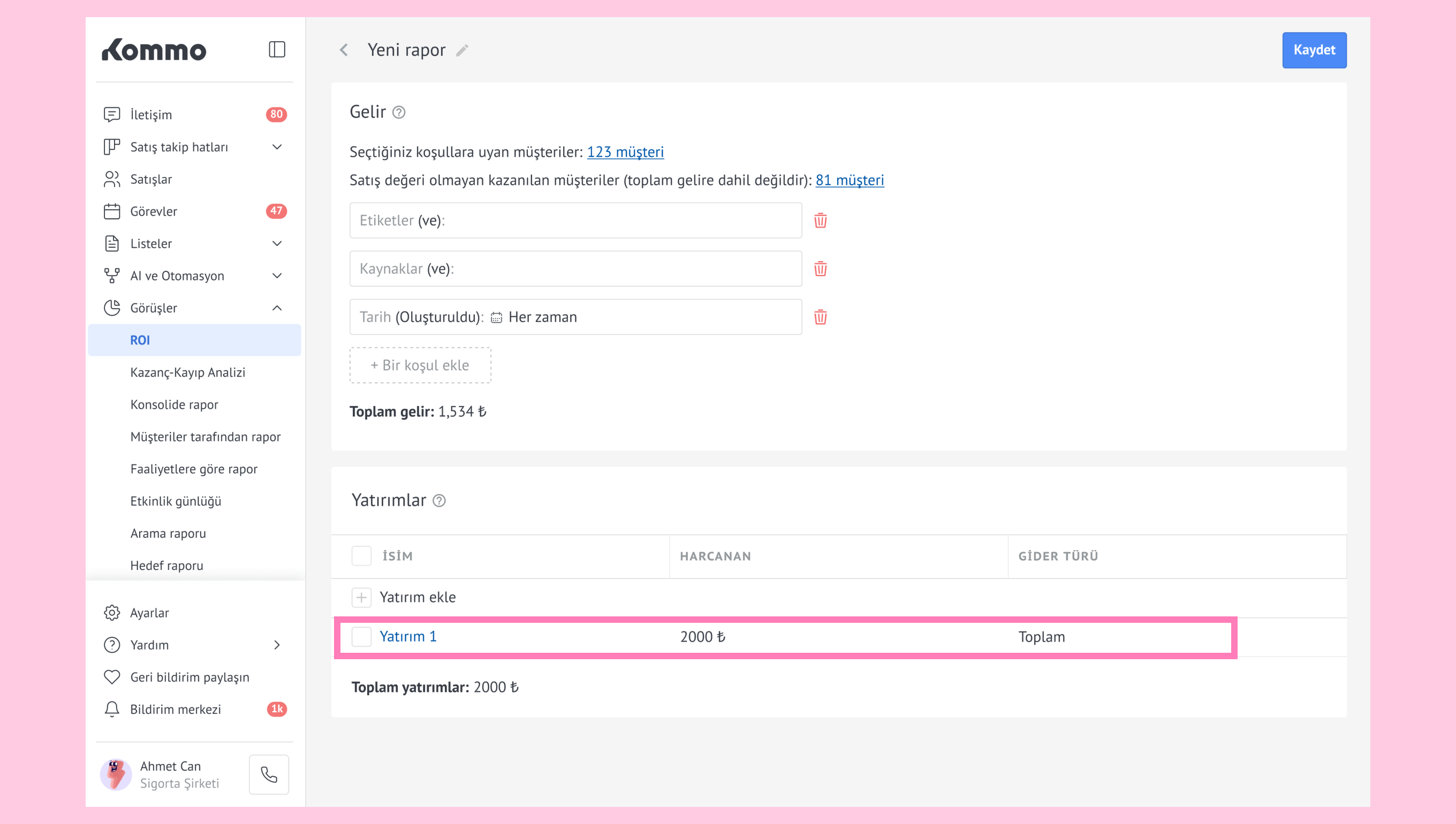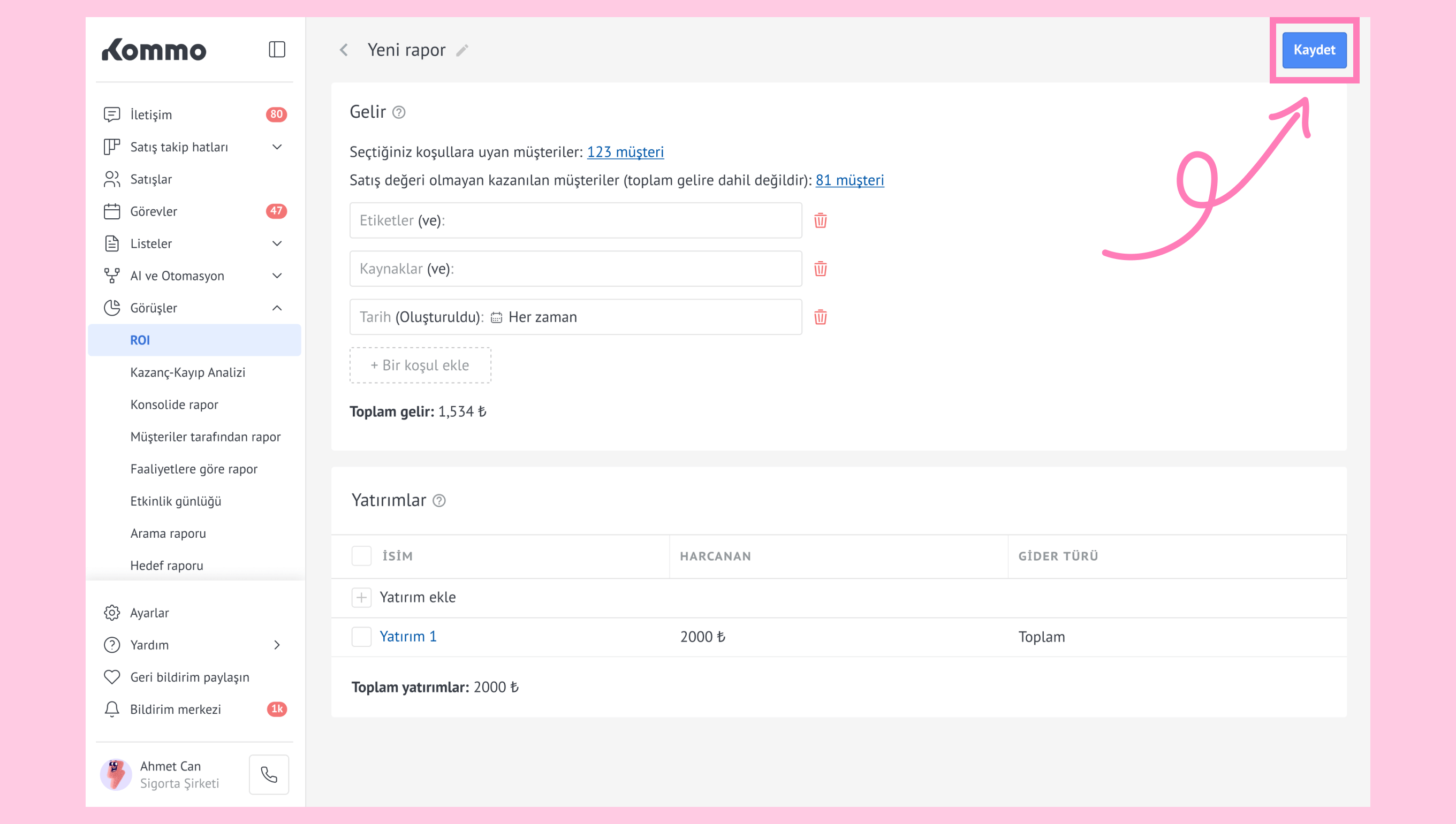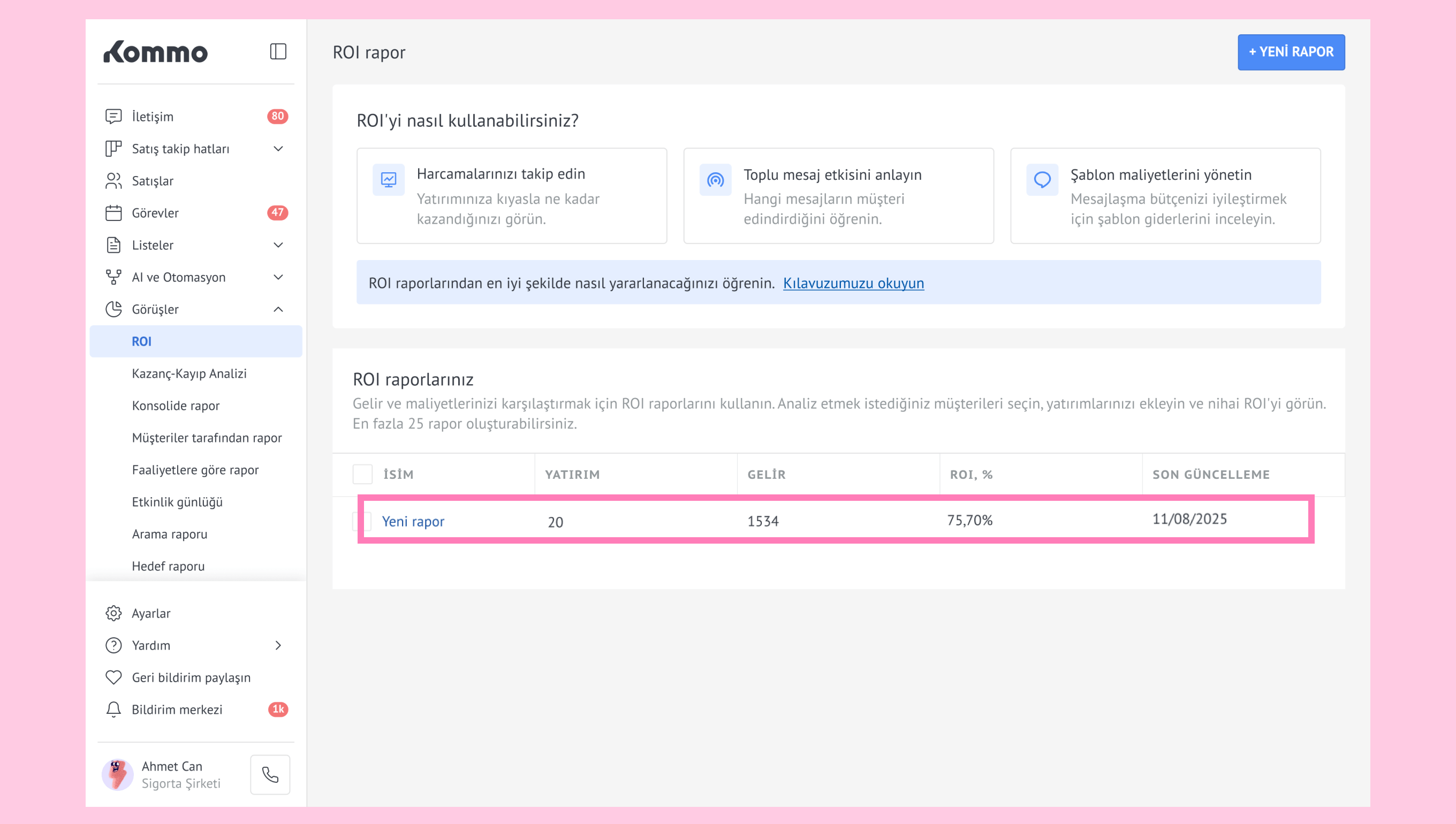 Kaydettikten sonra ROI bölümüne geri dönecek ve raporunuzu listede göreceksiniz.