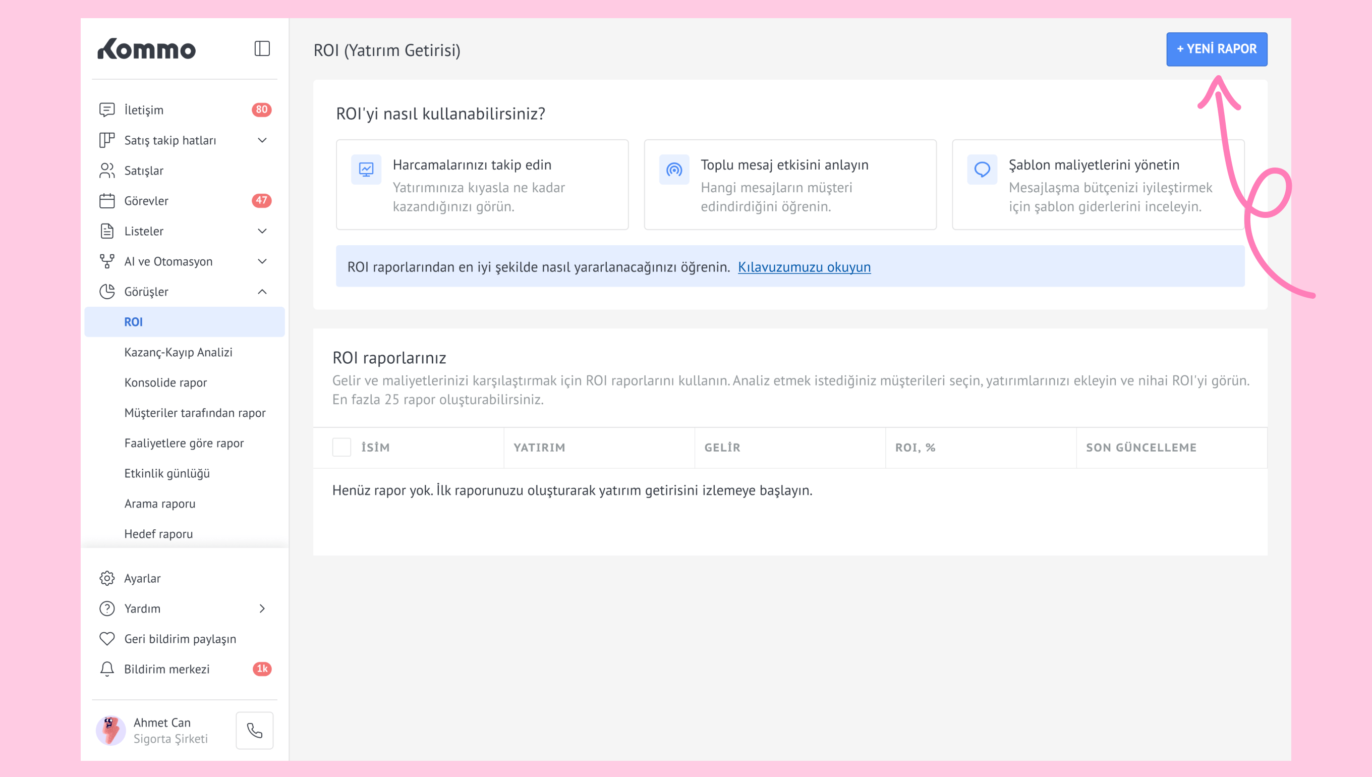 1. Görüşler → ROI'ye gidin ve + YENİ RAPOR'a tıklayın.