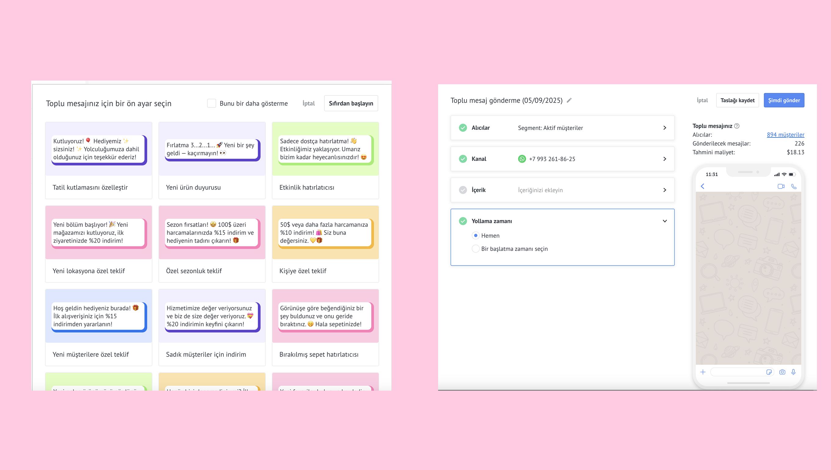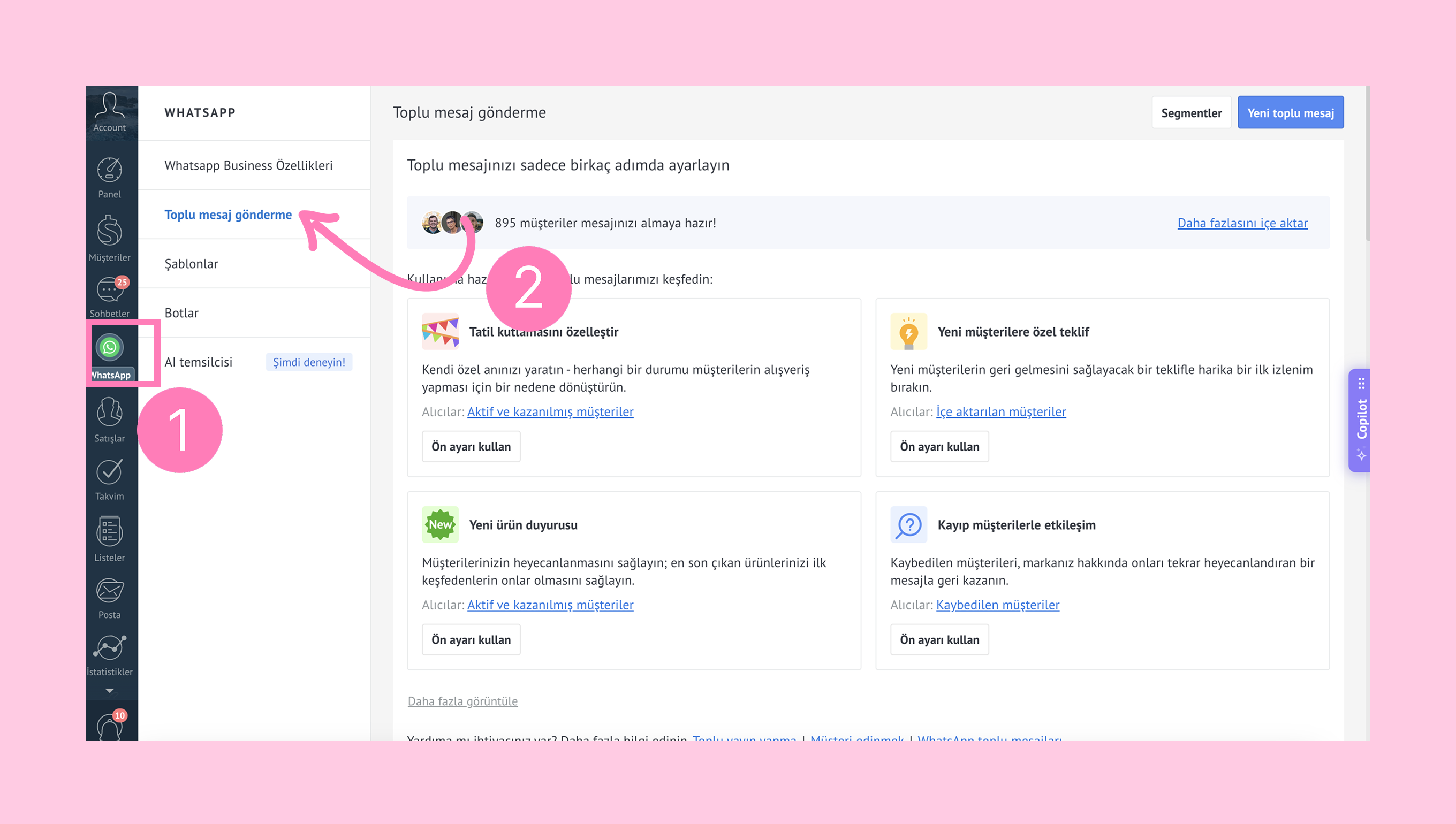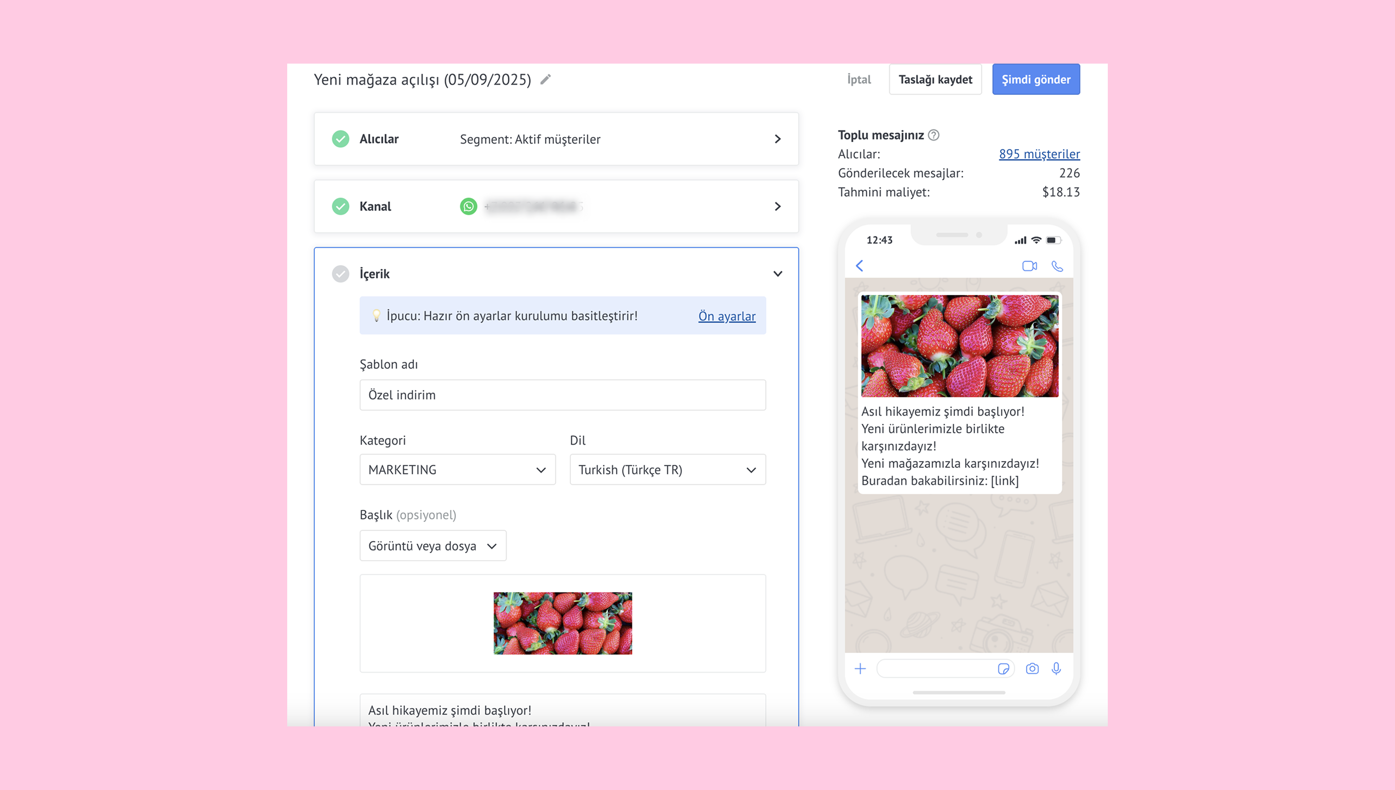 İpucu: Yayınlarda en iyi sonuçlar için, pazarlama ve servis mesajları konusunda en güçlü ve esnek desteği sunan WhatsApp Business entegrasyonunu kullanmanızı öneririz.