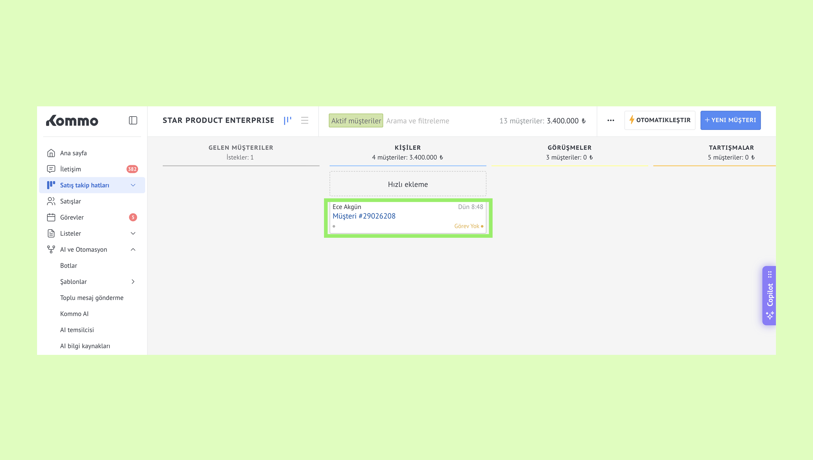 - Google Formlar'da yanıt veren müşteri, Kommo'da yeni bir müşteri haline gelir: