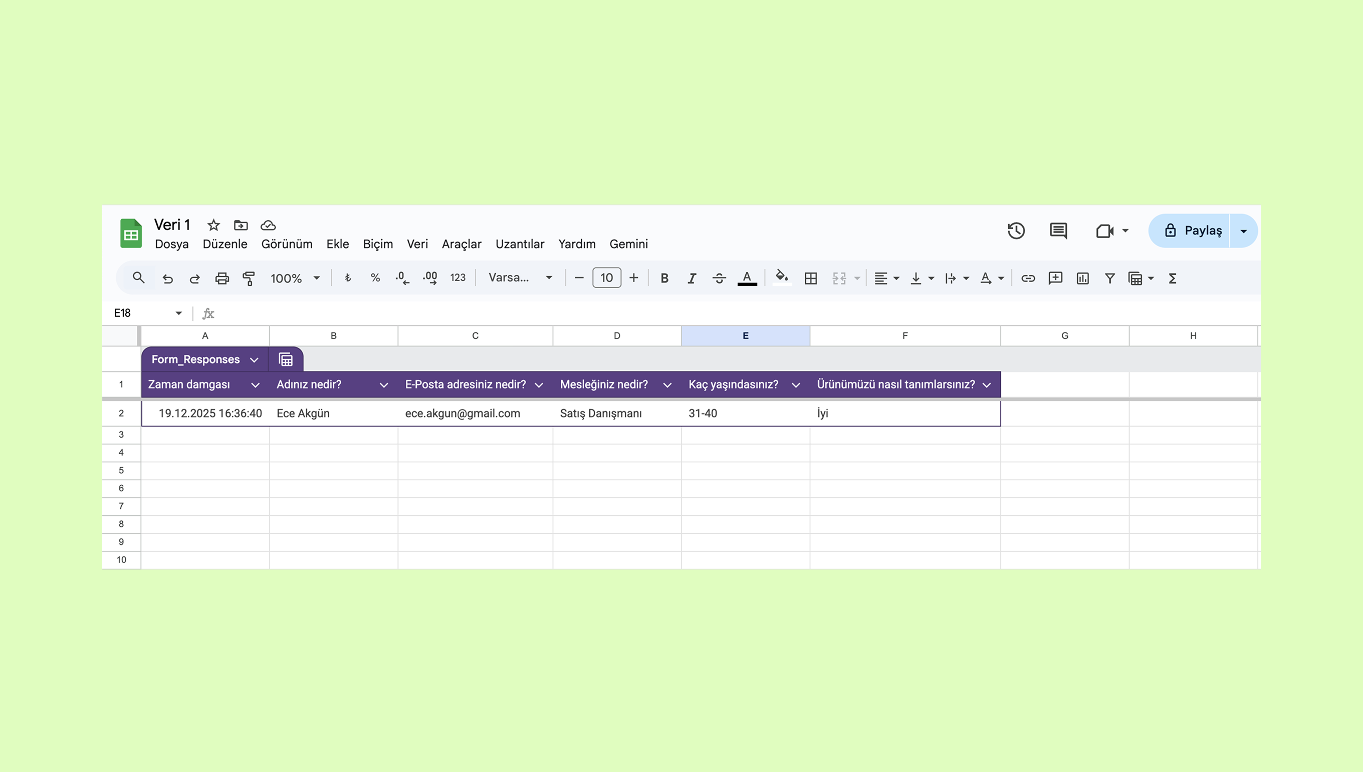 - Google Formu Google E-Tablolarda görünür: