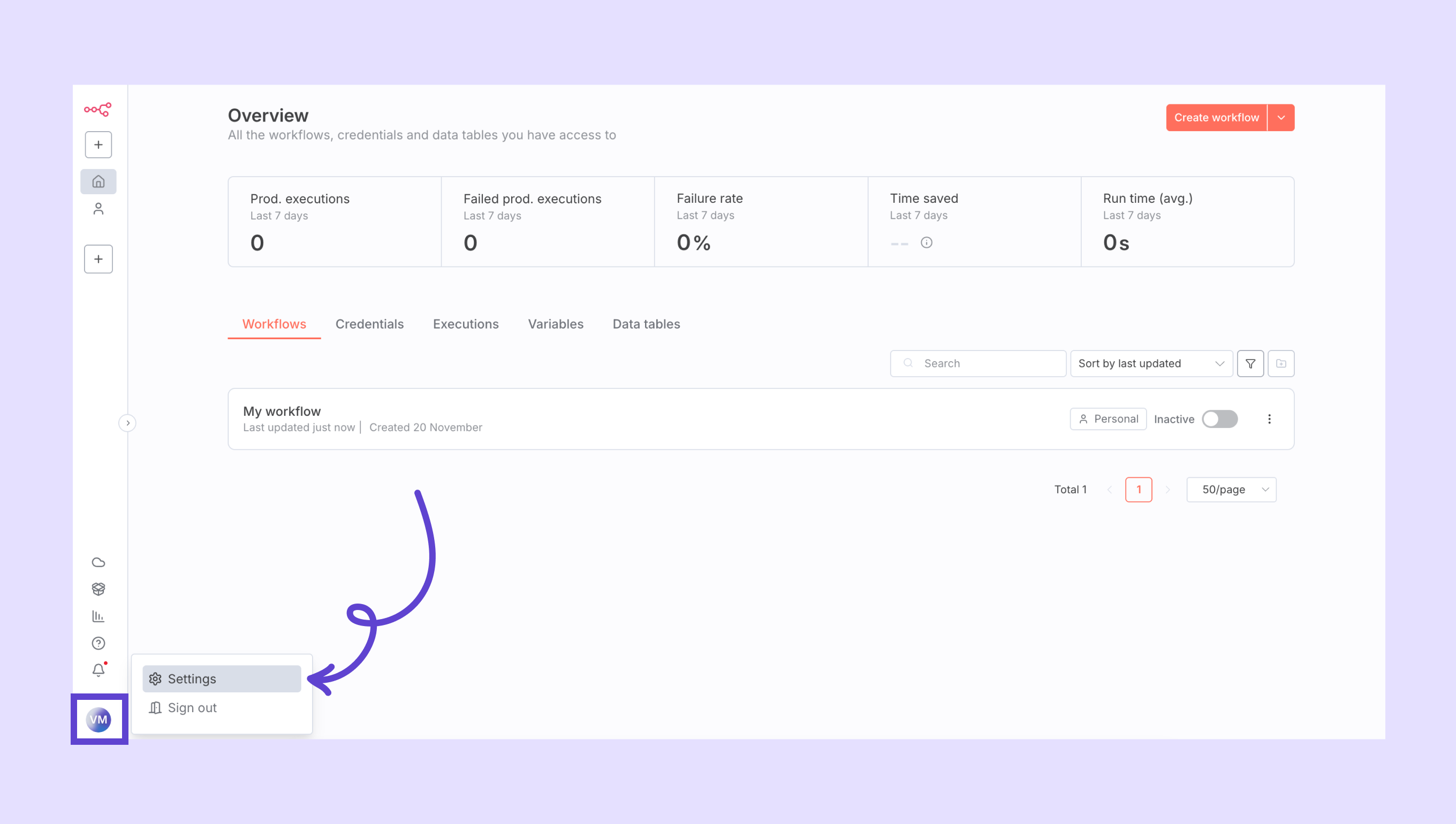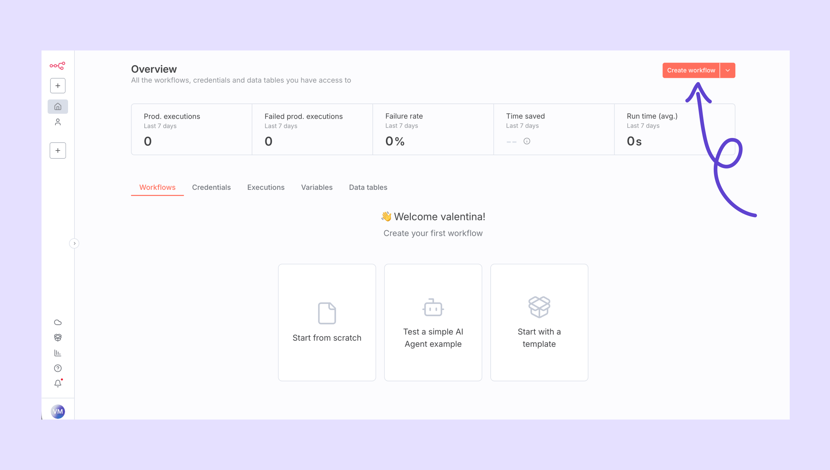 - n8n hesabınıza giriş yapın ve yeni bir iş akışı oluşturun.