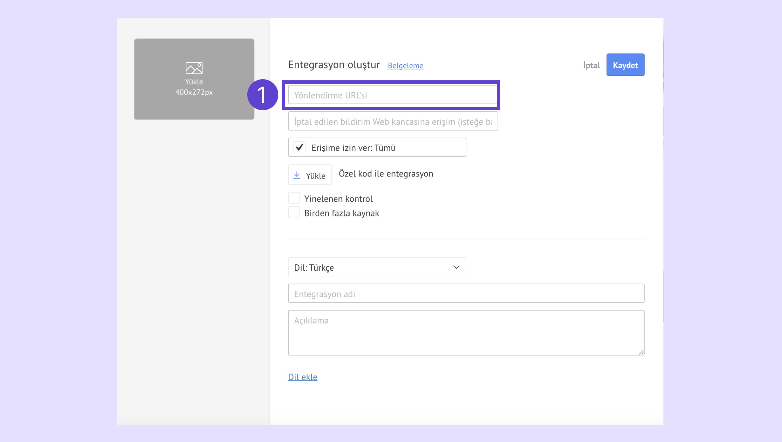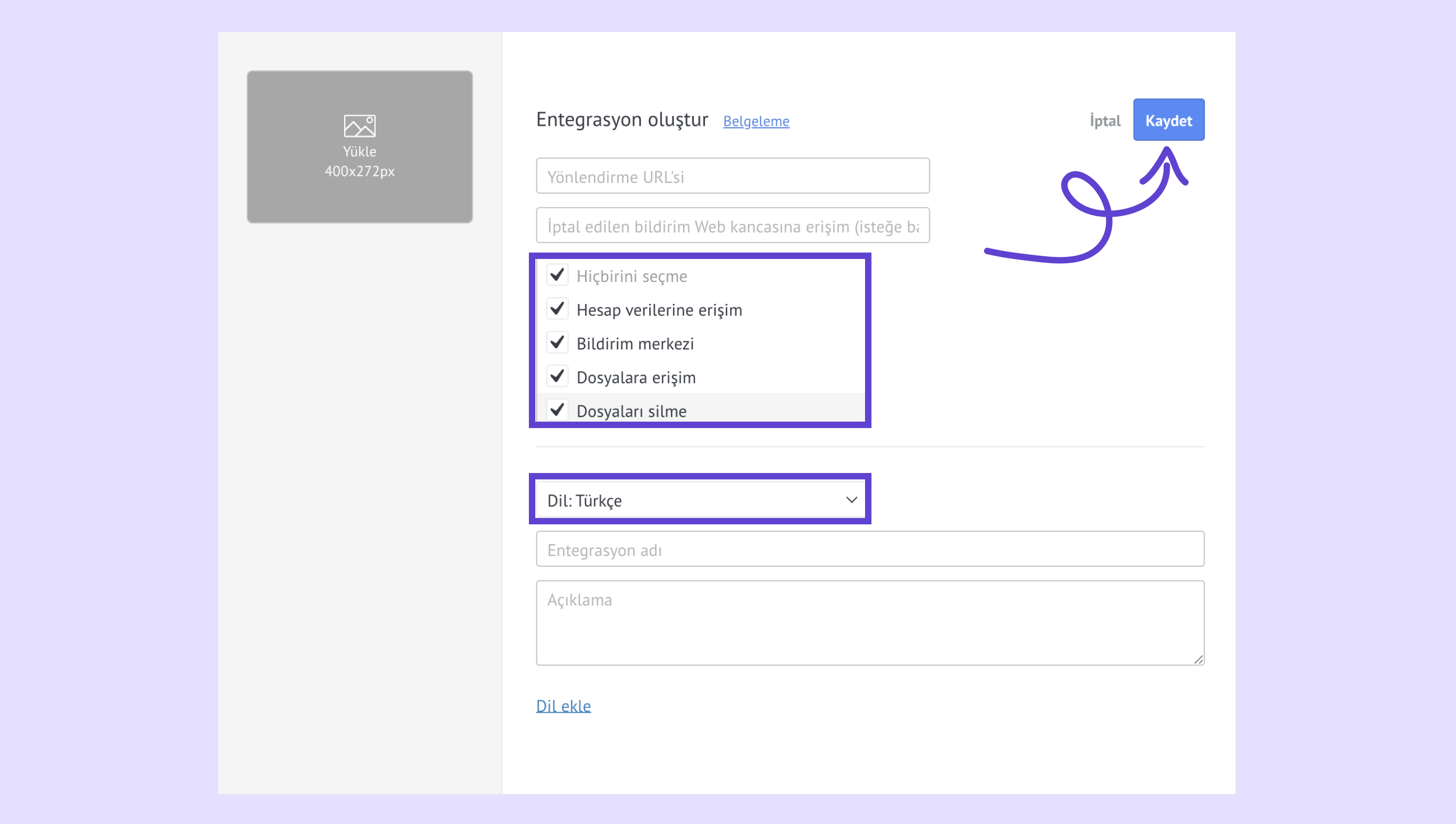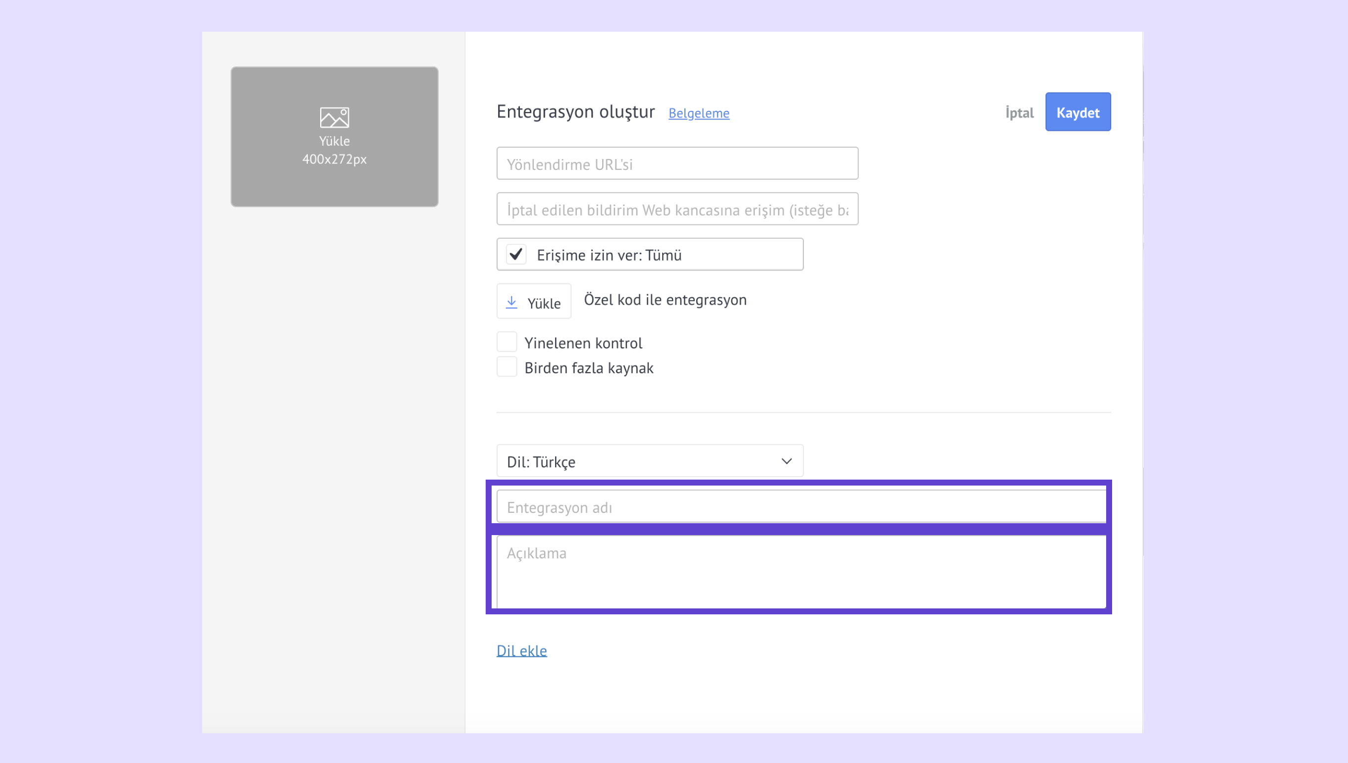Entegrasyon adını ve açıklamasını ekleyin.