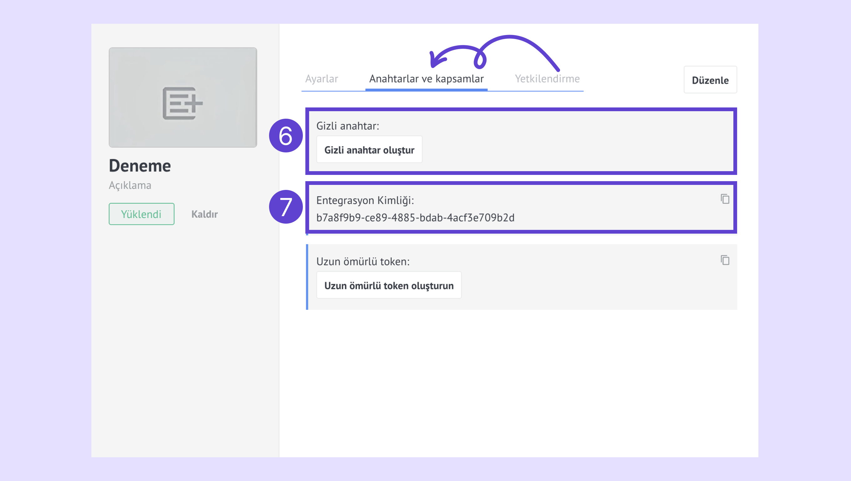 Anahtarlar ve kapsamlar sekmesini açın. Gizli anahtar oluşturun (6) ve Entegrasyon Kimliğinizi kopyalayın (7).