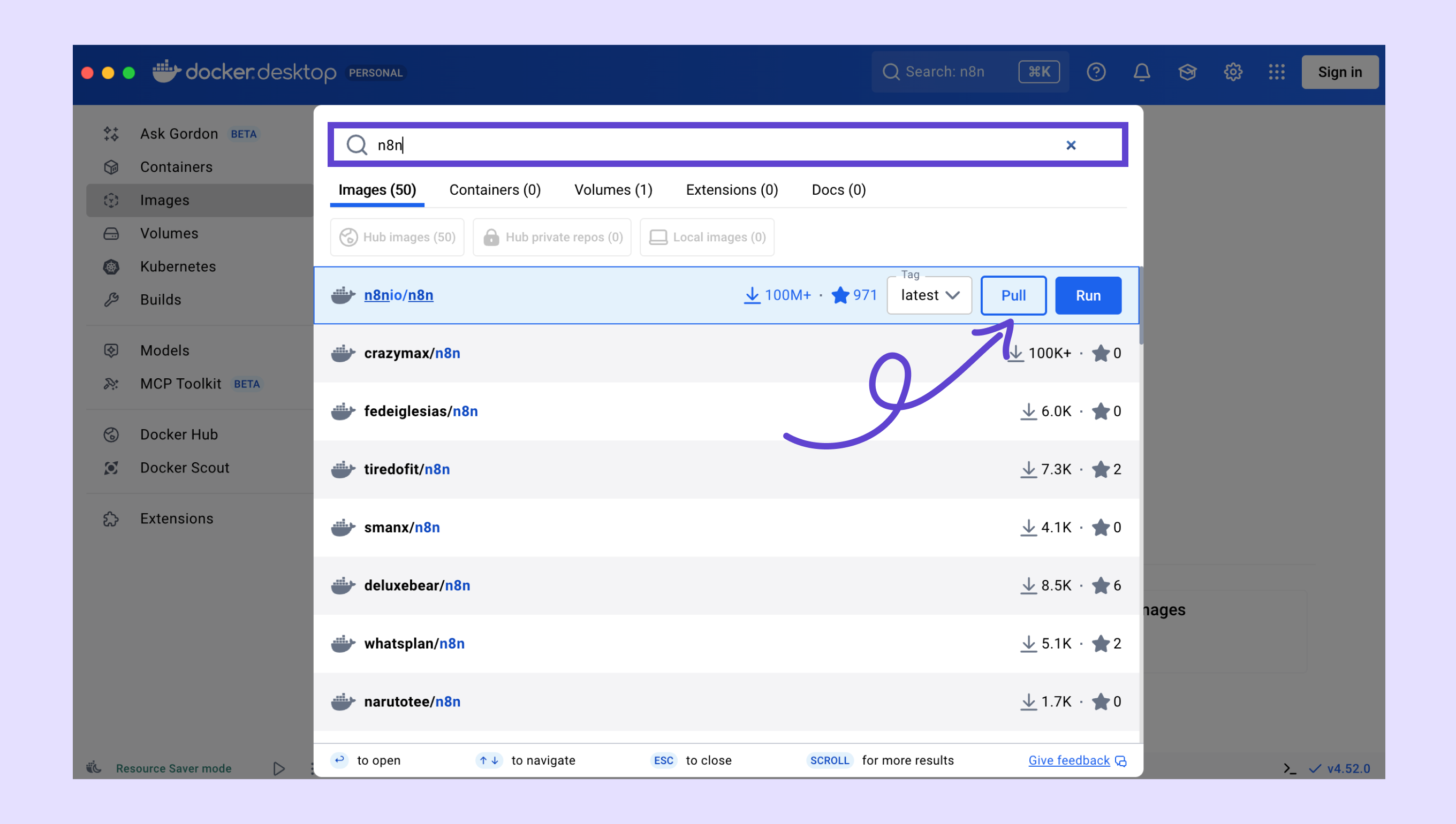 Bir arama penceresi açılacaktır. n8n yazın ve Pull tuşuna tıklayarak görüntüyü indirin.