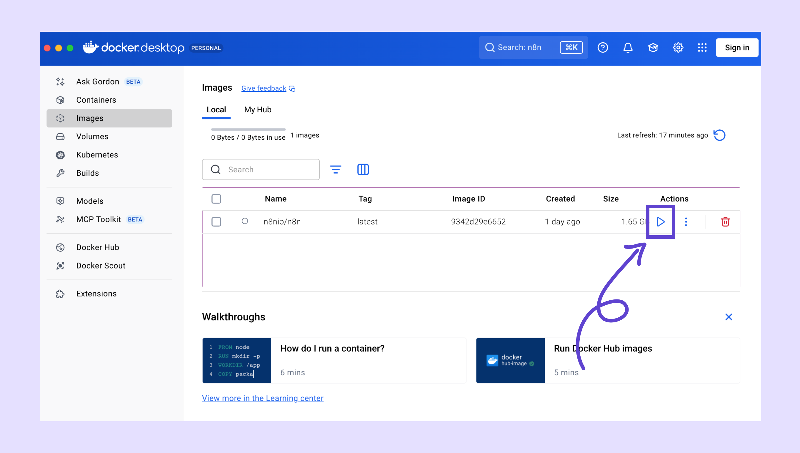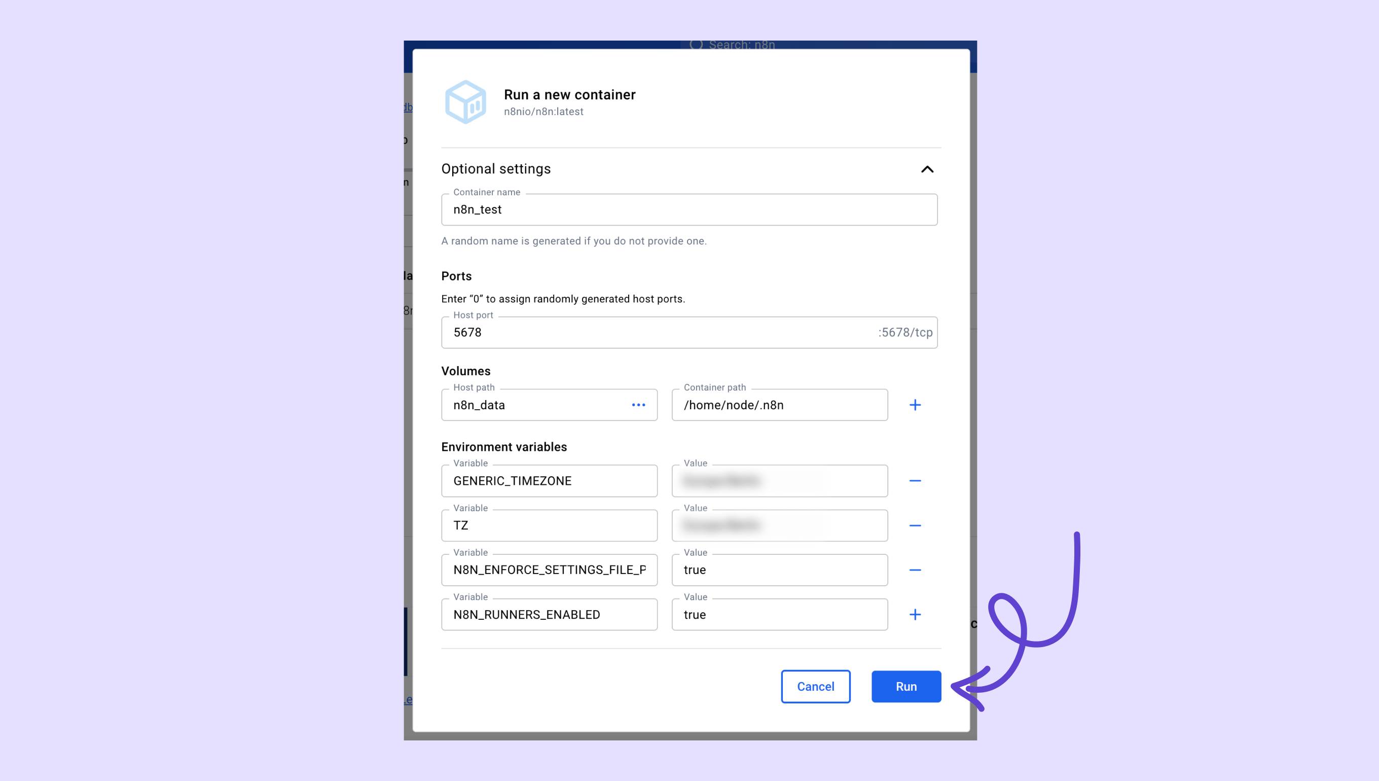 İndirme işlemi tamamlandığında, Çalıştır'ı tıklayarak konteyneri oluşturun.