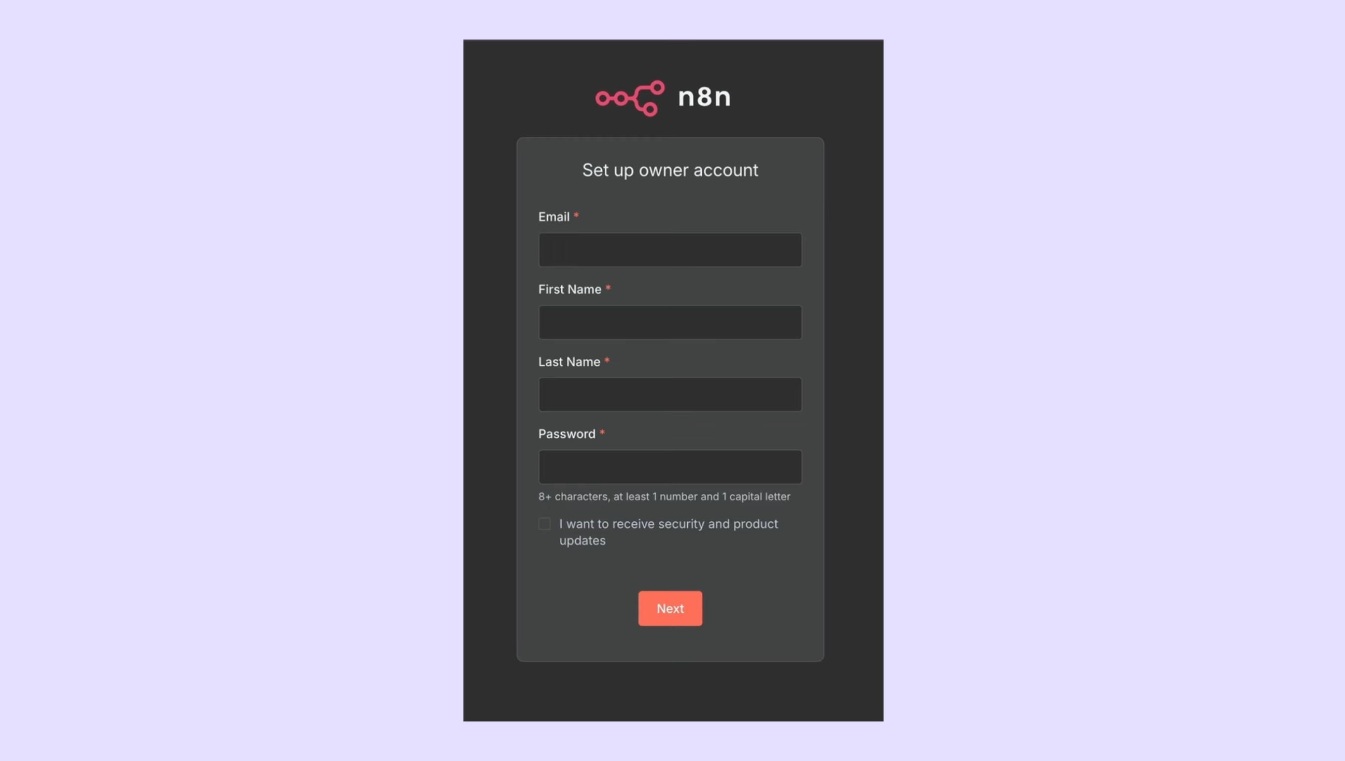 - Kurulum tamamlandıktan sonra, yerel n8n'inizi açın ve sahip hesabını ayarlayın.