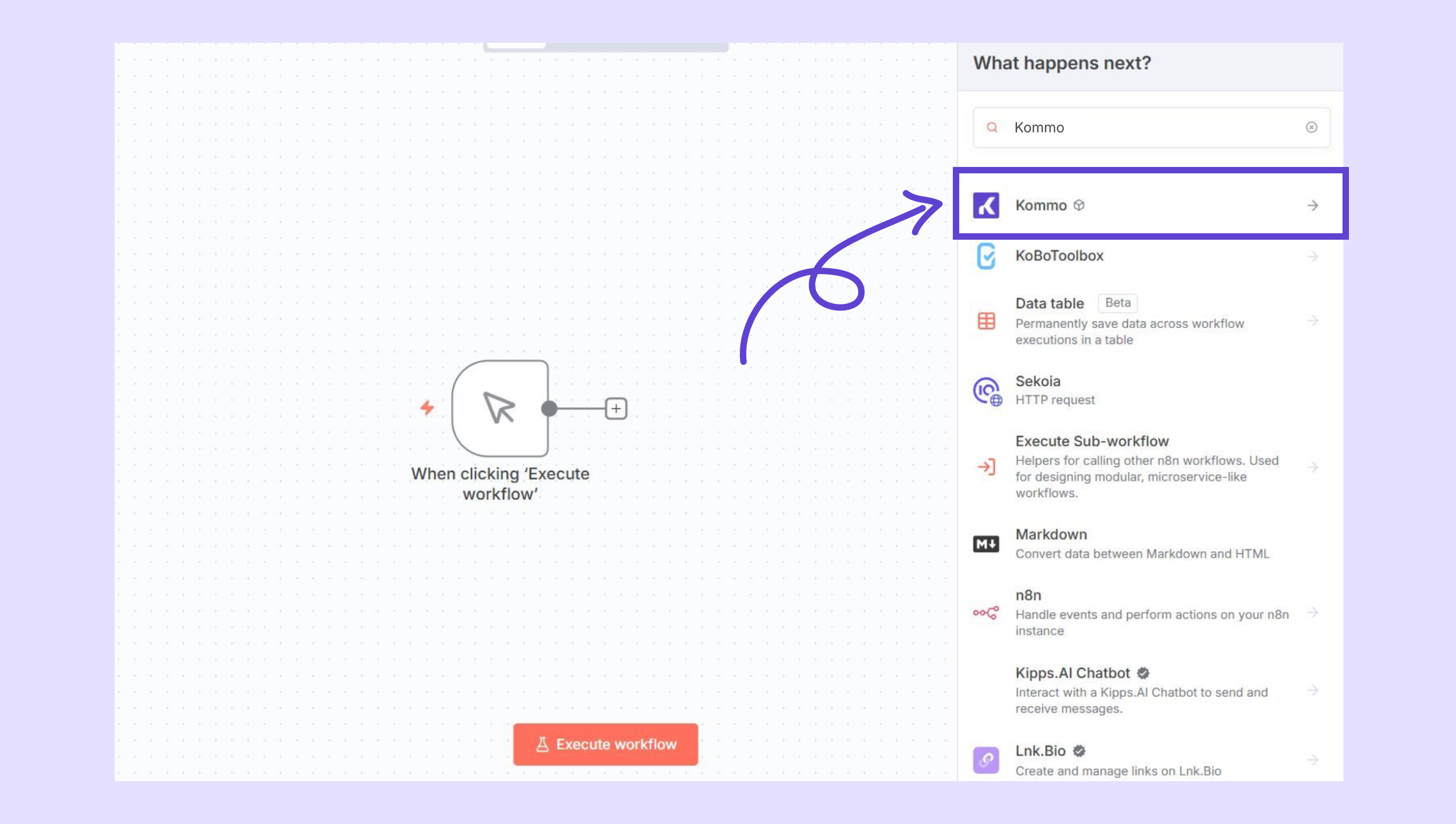 Kommo düğümü artık düğüm listenizde görünecektir. Bunu n8n ile bağlamak için bir iş akışı oluşturun ve + simgesine tıklayın.