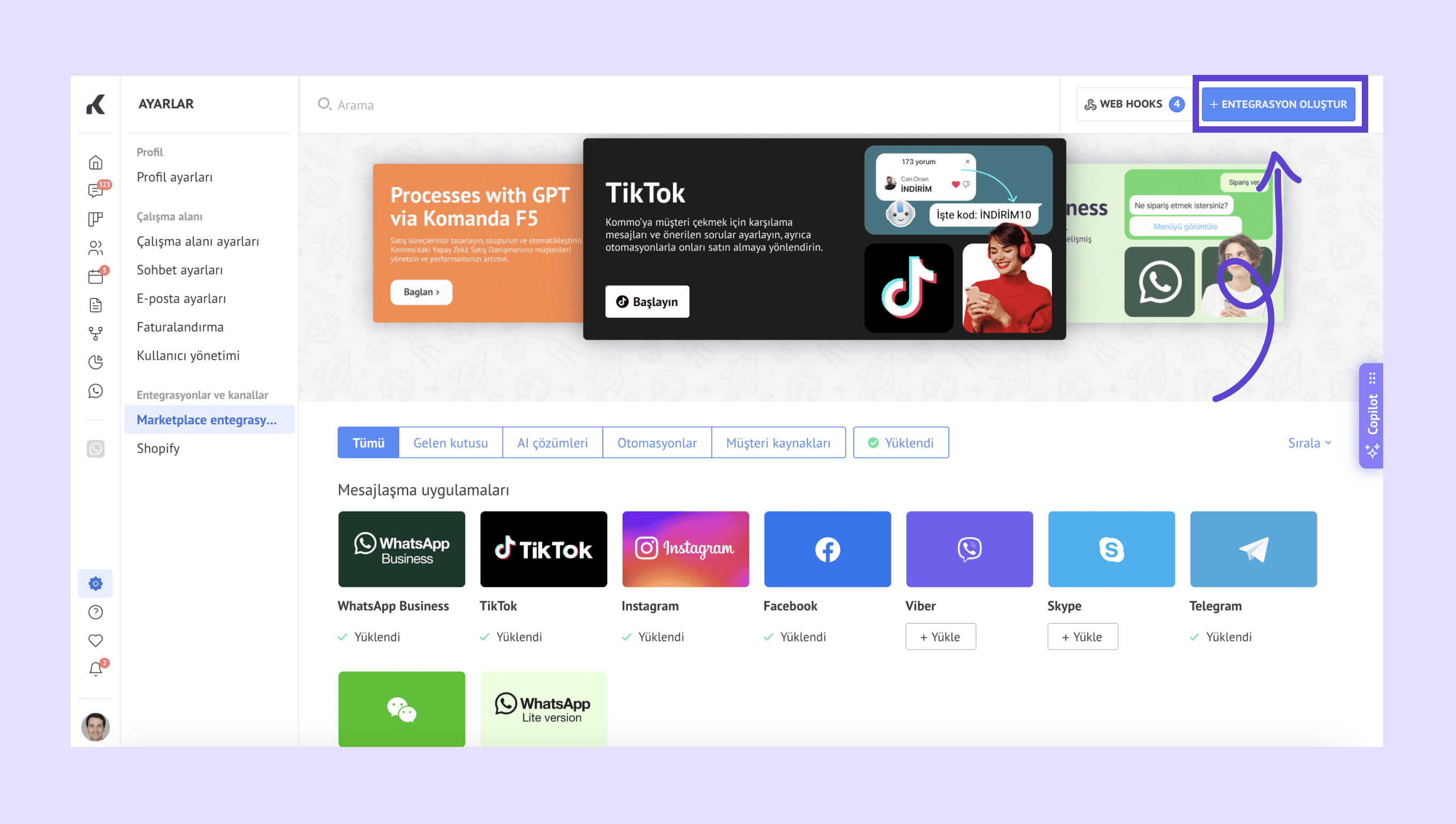 Kommo hesabınızda Ayarlar → Entegrasyon pazarı bölümüne gidin. Ardından + Entegrasyon oluştur seçeneğine tıklayın.
