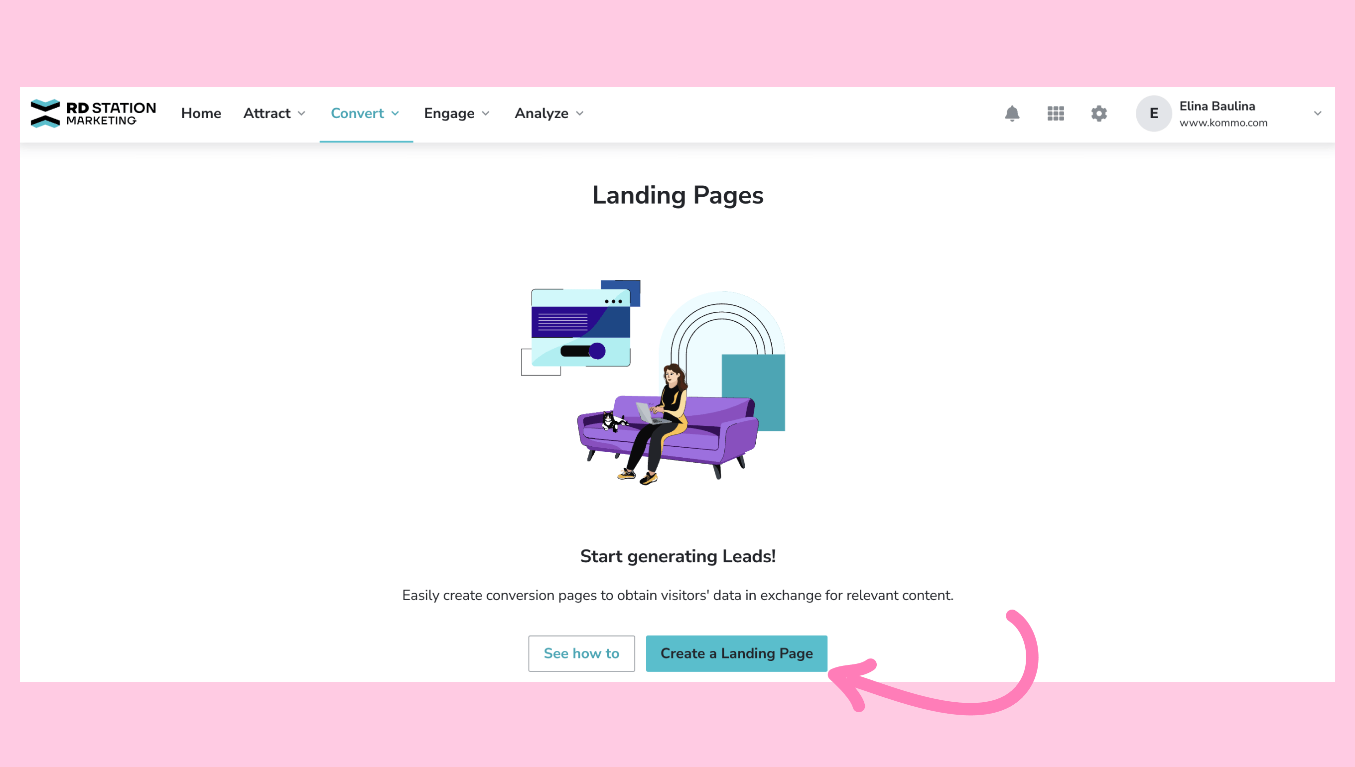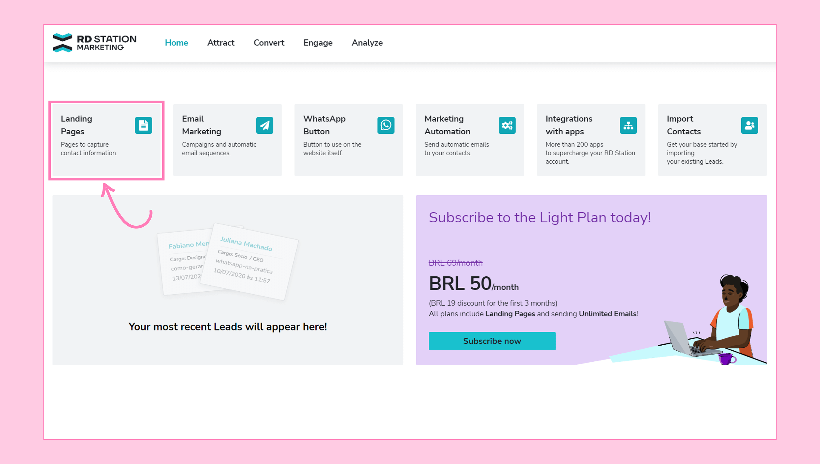 RD Station ana sayfanızdan, Açılış Sayfaları'nı seçin.