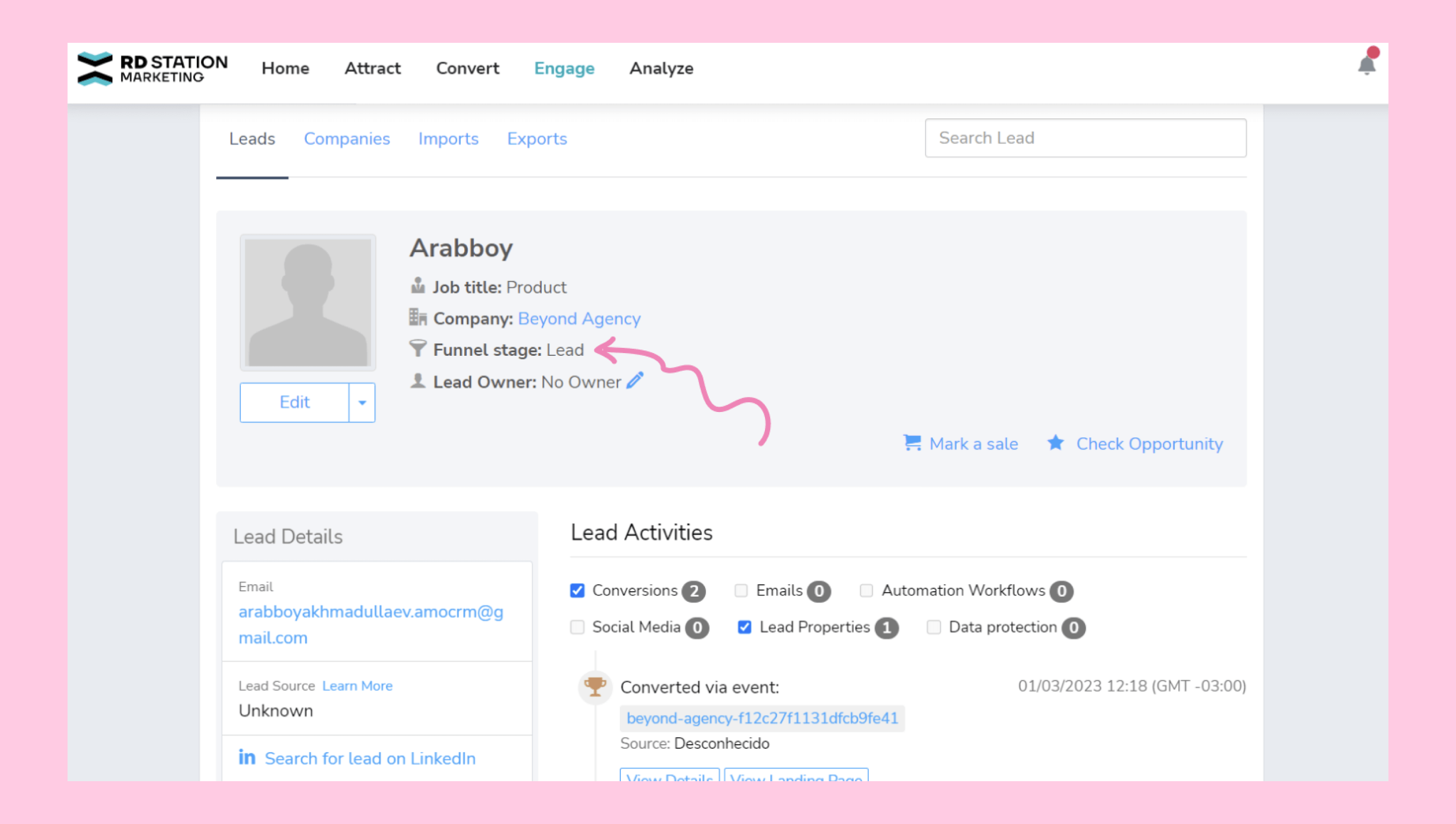 Kapalı-Kazanıldı'ya taşıma → Müşteri, RD Station'da Müşteri aşamasına geçer ve Fırsat etiketini alır.