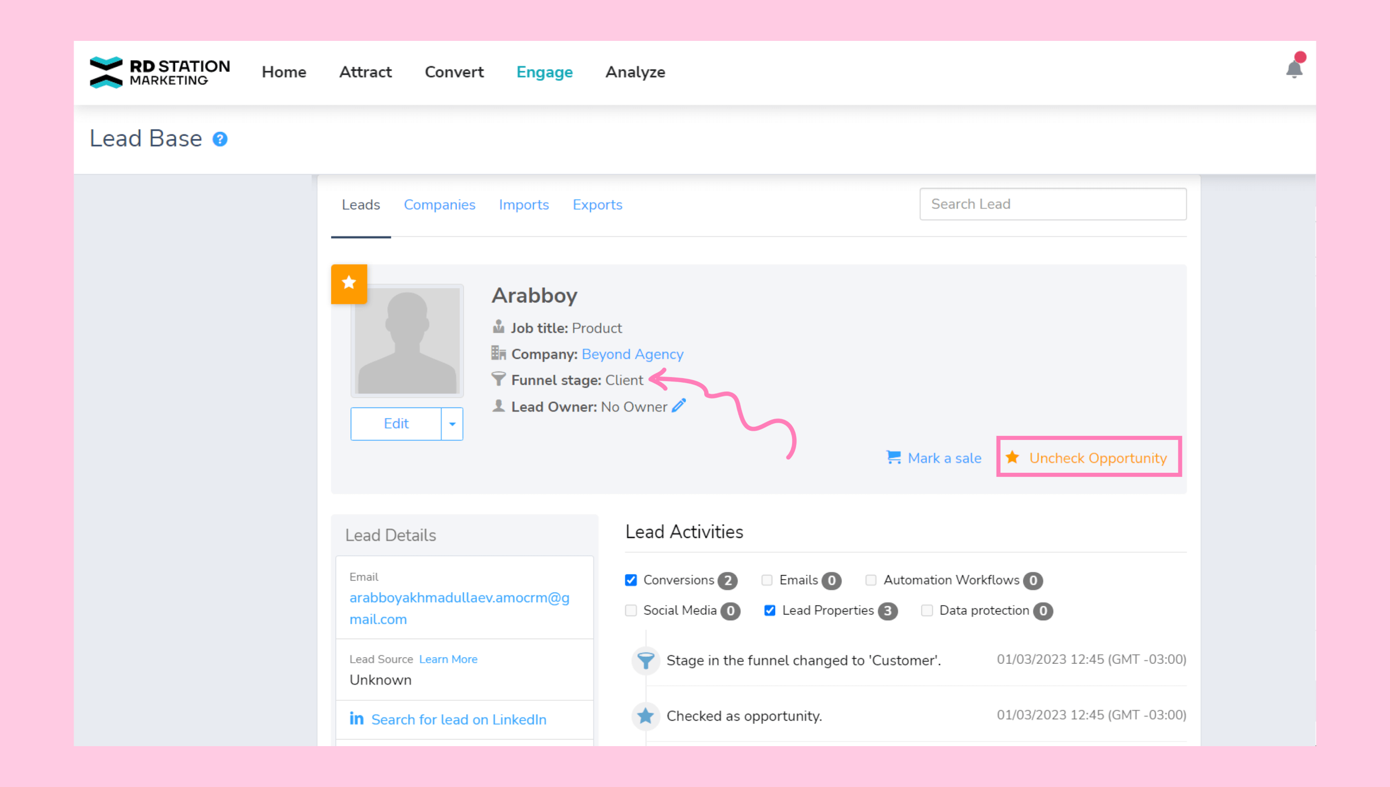 Kapalı-Kaybedildi'ye taşıma → müşteri RD Station'da Müşteri olarak kalır ve daha önce Fırsat etiketi eklenmişse, bu etiket kaldırılır.