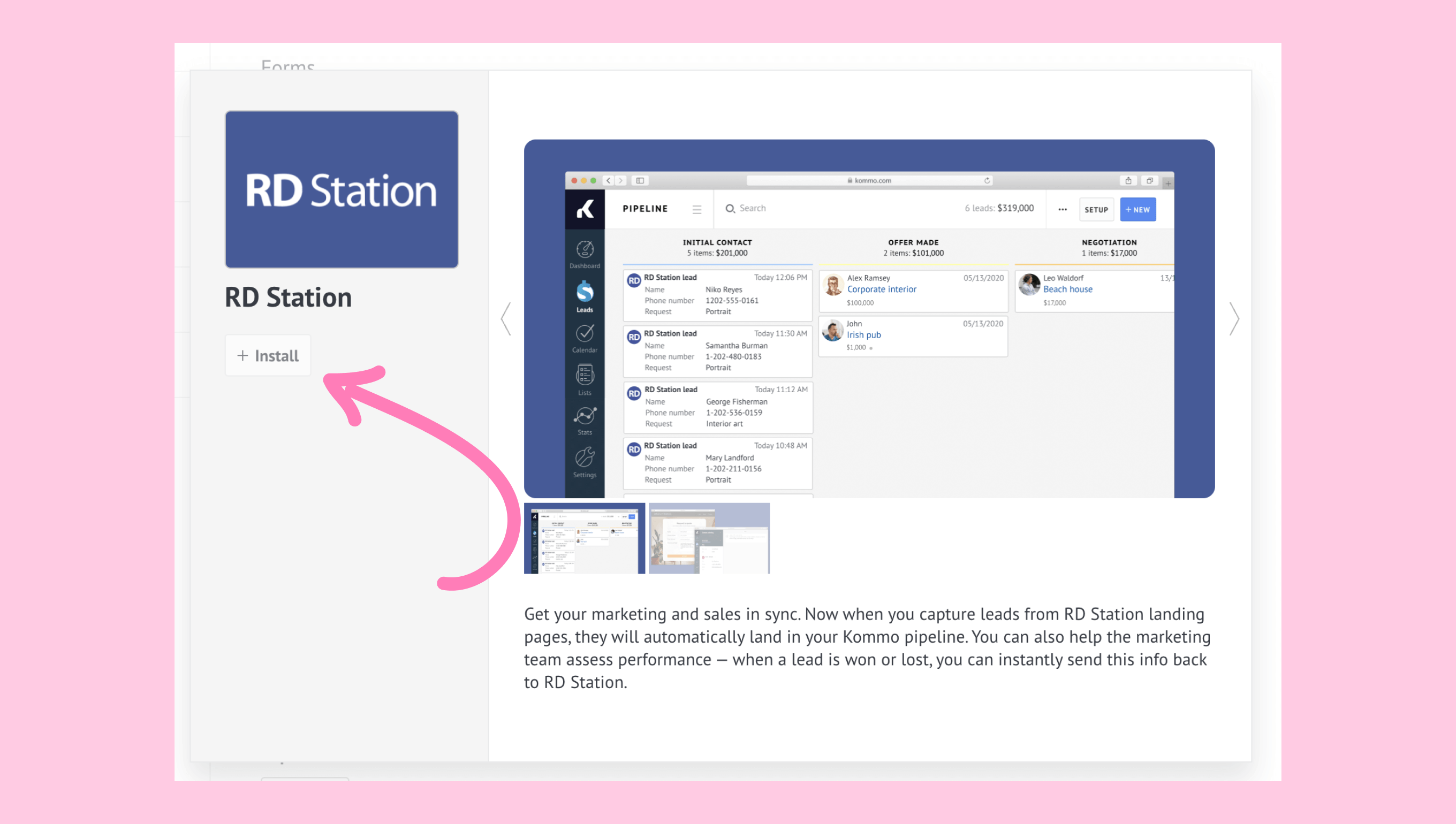 RD Station'ı Kommo ile entegre ederek, pazarlama ve satış ekipleriniz arasında bağlantı kurarsınız. RD Station açılış sayfalarından gelen potansiyel müşteriler otomatik olarak Kommo'ya eklenir, böylece temsilciler anında takip edebilir. Potansiyel müşteriler Kommo'da aşamalardan geçerken, durumları RD Station'da güncellenir, böylece her iki platform da senkronize kalır ve ekibinizin performansı takip etmesine, ROI'yi ölçmesine ve daha fazla potansiyel müşteriyi dönüştürmesine yardımcı olur.