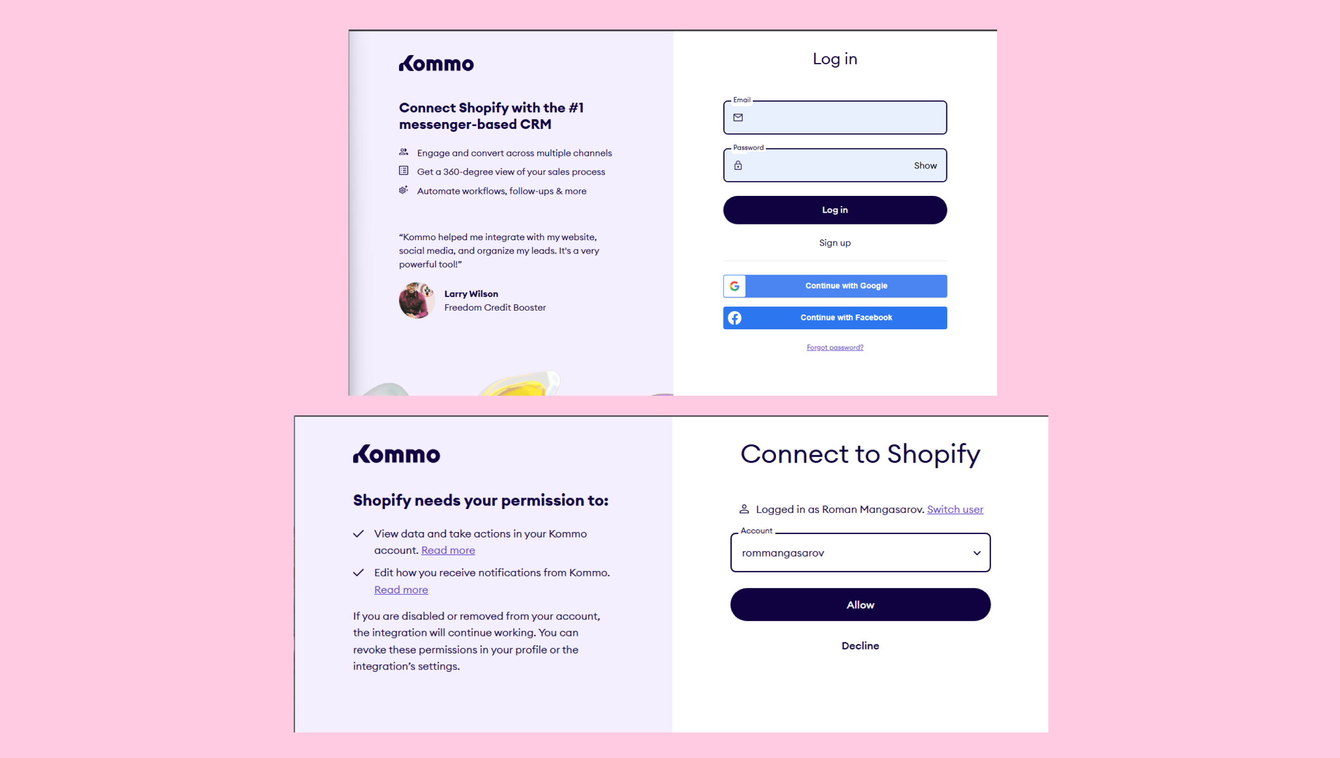 - Kommo hesabınıza giriş yapın veya yeni bir hesap oluşturun ve gerekli izinleri verin.