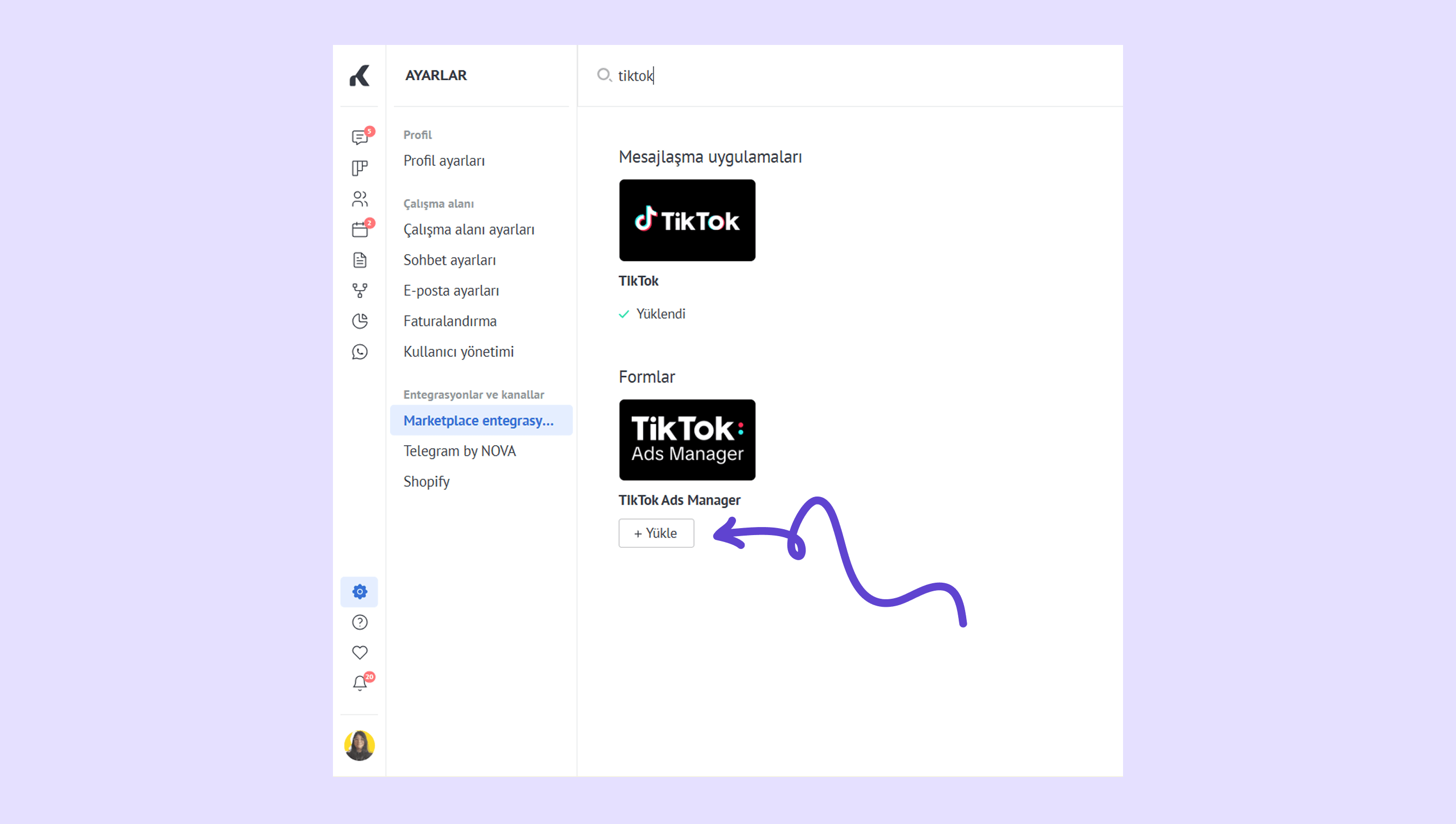 Entegrasyon pazarına gidin → TikTok Ads Manager'ı arayın.